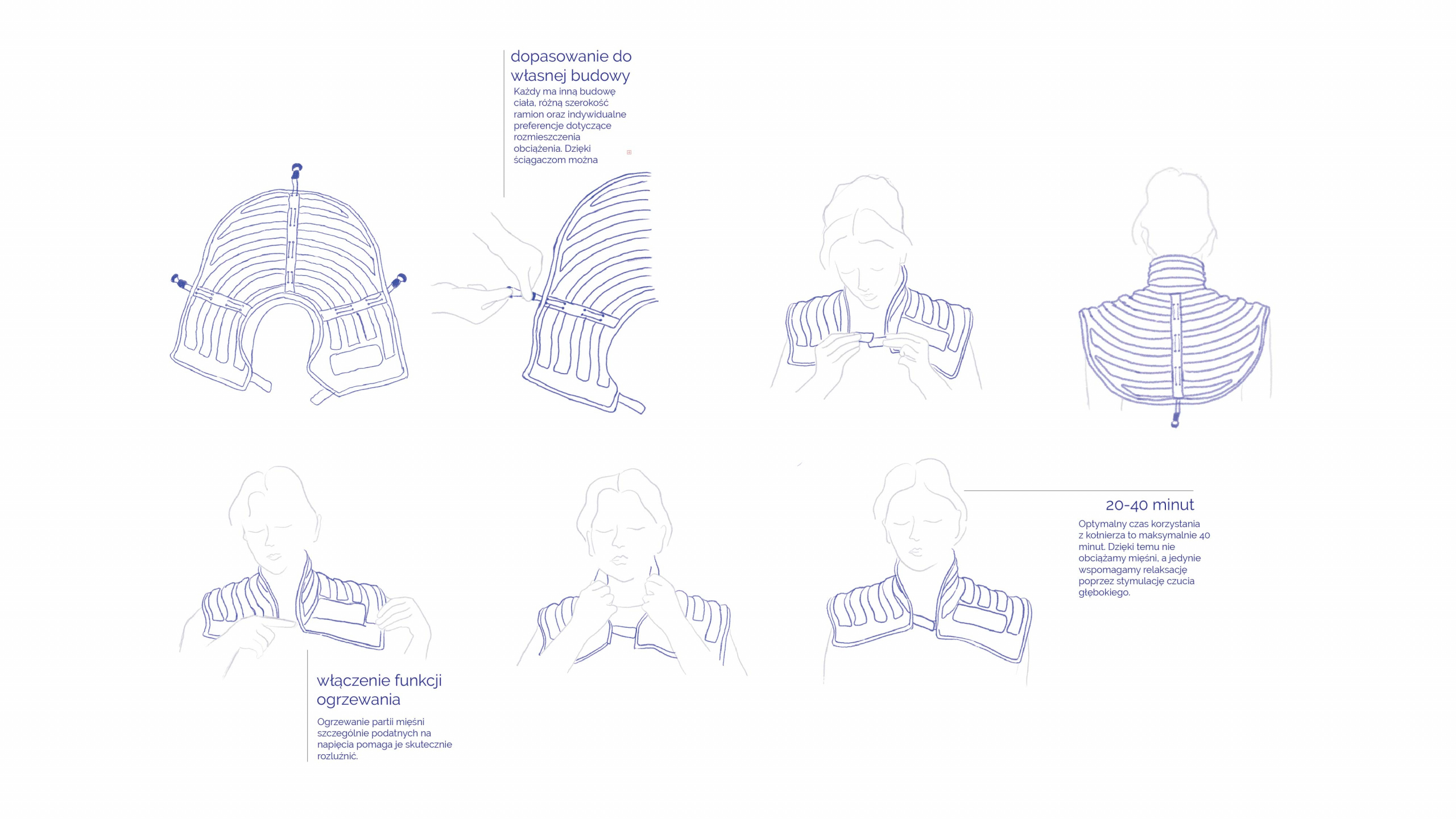Kamizelka obciążeniowa wspiera wytchnienie poprzez stymulację zmysłu propriocepcji i dotyku. Odpowiednio rozmieszczone obciążenie wywołuje efekt głębokiego nacisku, sprzyjając relaksowi i redukcji napięcia mięśni. Dodatkowa funkcja ogrzewania wzmacnia komfort użytkowania. Kamizelka została zaprojektowana z myślą o osobach narażonych na stres i napięcie mięśniowe potrzebujących chwili odprężenia. Zastosowanie ściągaczy pozwala dopasować produkt do indywidualnych wymiarów użytkownika. Przeznaczony jest do użytkowania w pozycjach siedzącej lub stojącej.
