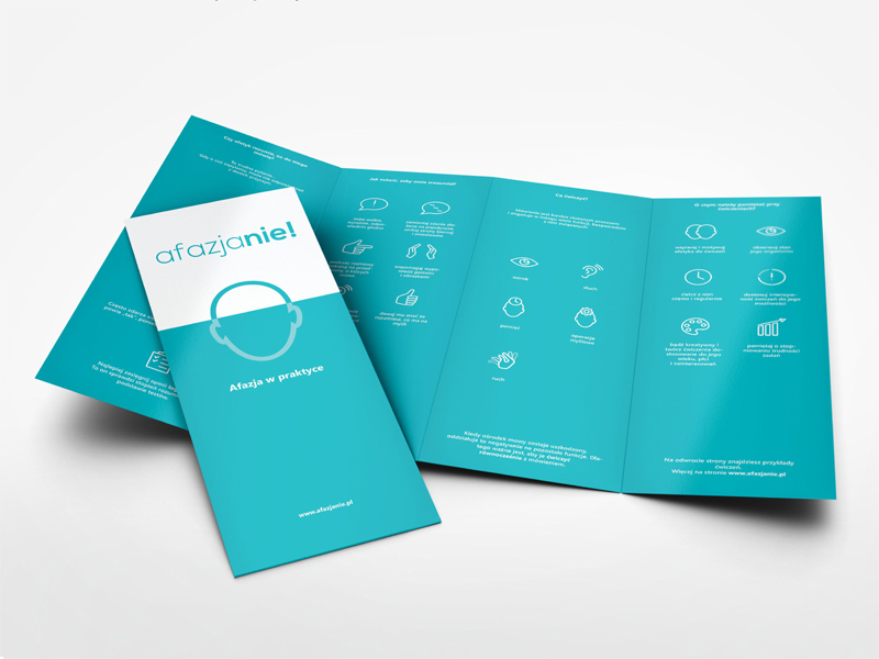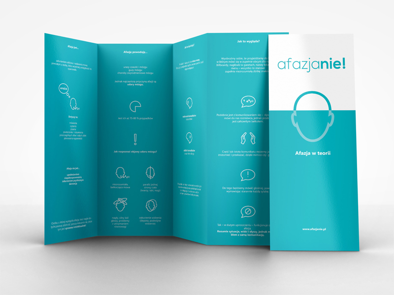 Celem mojego projektu jest zwiększenie świadomości społecznej na temat afazji, jej przyczyn i sposobie zapobiegania oraz zapewnienie wsparcia informacyjnego dla opiekunów. Pierwsza strona ulotki „Afazja w praktyce" pierwsza strona u Projekt składa się z plakatu, podkreślającego główną lotki „Afazja w teorii" przyczynę afazji jaką jest udar mózgu, której można zapobiec przez natychmiastową pomoc. Ulotki dla opiekunów zawierają informacje teoretyczne oraz praktyczne, potrzebne do zrozumienia problemu afazji oraz przedstawiają sposoby komunikacji i ćwiczeń językowych. Strona internetowa jest głównym źródłem informacji afazji i ćwiczeniach możliwych do wykonania w domu. W moim projekcie podkreśliłam rolę opiekuna w procesie rehabilitacji. Dzięki podstawowej wiedzy, poczucia wsparcia i narzędzi potrzebnych do ćwiczeń, opiekun przyczynia się do zwiększenia efektywności rehabilitacji, a co za tym idzie przywrócenia komunikacji z otoczeniem. Mój projekt może być wstępem do kampanii społecznej. Dzięki niej można przyczynić się do zmniejszenia liczby przypadków afazji lub chociażby do przyśpieszenia procesu rehabilitacji.