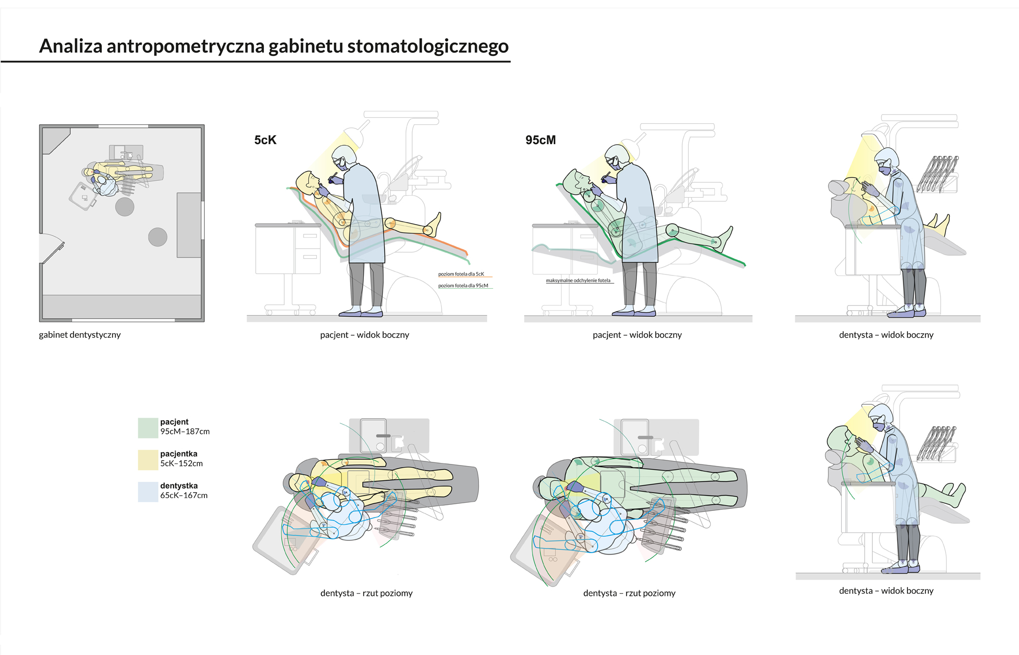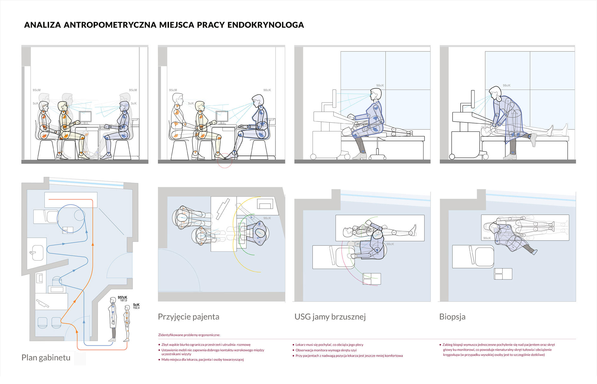 Ćwiczenie ma na celu zapoznanie się z narzędziami wspomagającymi proces projektowania ergonomicznego, z wykorzystaniem fantomów antropometrycznych w programie graficznym. Posłużyliśmy się fantomami osób reprezentujących 5. i 95. centyl populacji, oraz sylwetką lekarza (wysoka kobieta 187 cm), w skali 1:10. Przedmiotem analizy jest stanowisko pracy lekarza endokrynologa, uwzględniające także interakcję z pacjentem. Wizualizacja ruchu w postaci wykresu sznurowego ilustruje złożoność ścieżki, jaką podczas wizyty pokonuje zarówno lekarz, jak i pacjent. Analizie poddano trzy kluczowe strefy funkcjonalne gabinetu: