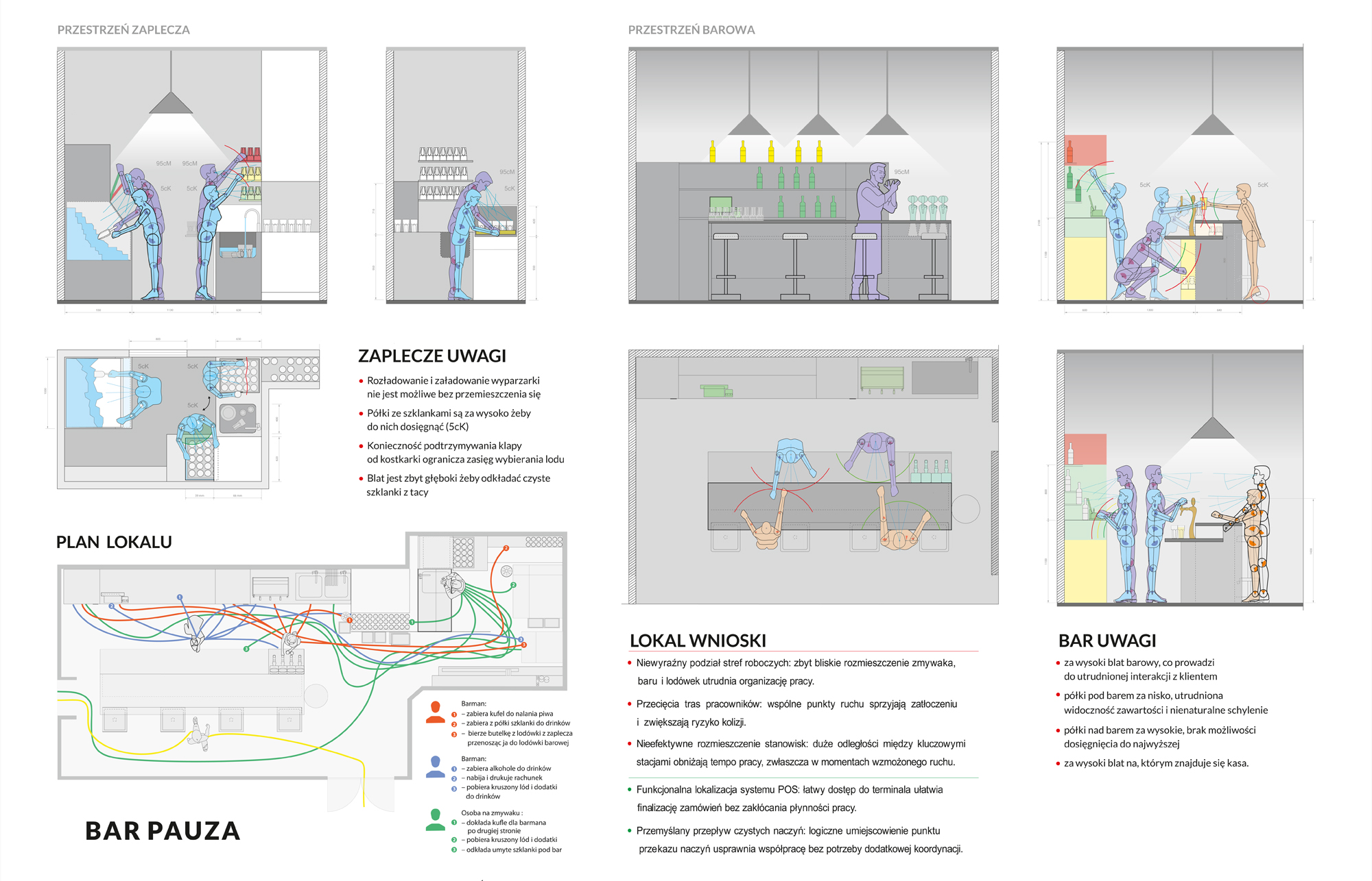 Ćwiczenie miało na celu zapoznanie się z narzędziami wspomagającymi projektowanie ergonomiczne, z wykorzystaniem fantomów antropometrycznych w środowisku graficznym. Posłużono się fantomami w skali 1:10, reprezentującymi osoby 5. i 95. centyla populacji polskiej. Na tej podstawie przeprowadzono analizę relacji przestrzennych pomiędzy pracownikami a klientami, jak również pomiędzy personelem a meblami i wyposażeniem technicznym lokalu. Zidentyfikowano i wypisano uwagi dotyczące niewłaściwej organizacji przestrzennej, rozmieszczenia funkcji, stanowisk pracy oraz przedmiotów wykorzystywanych podczas obsługi klientów. .