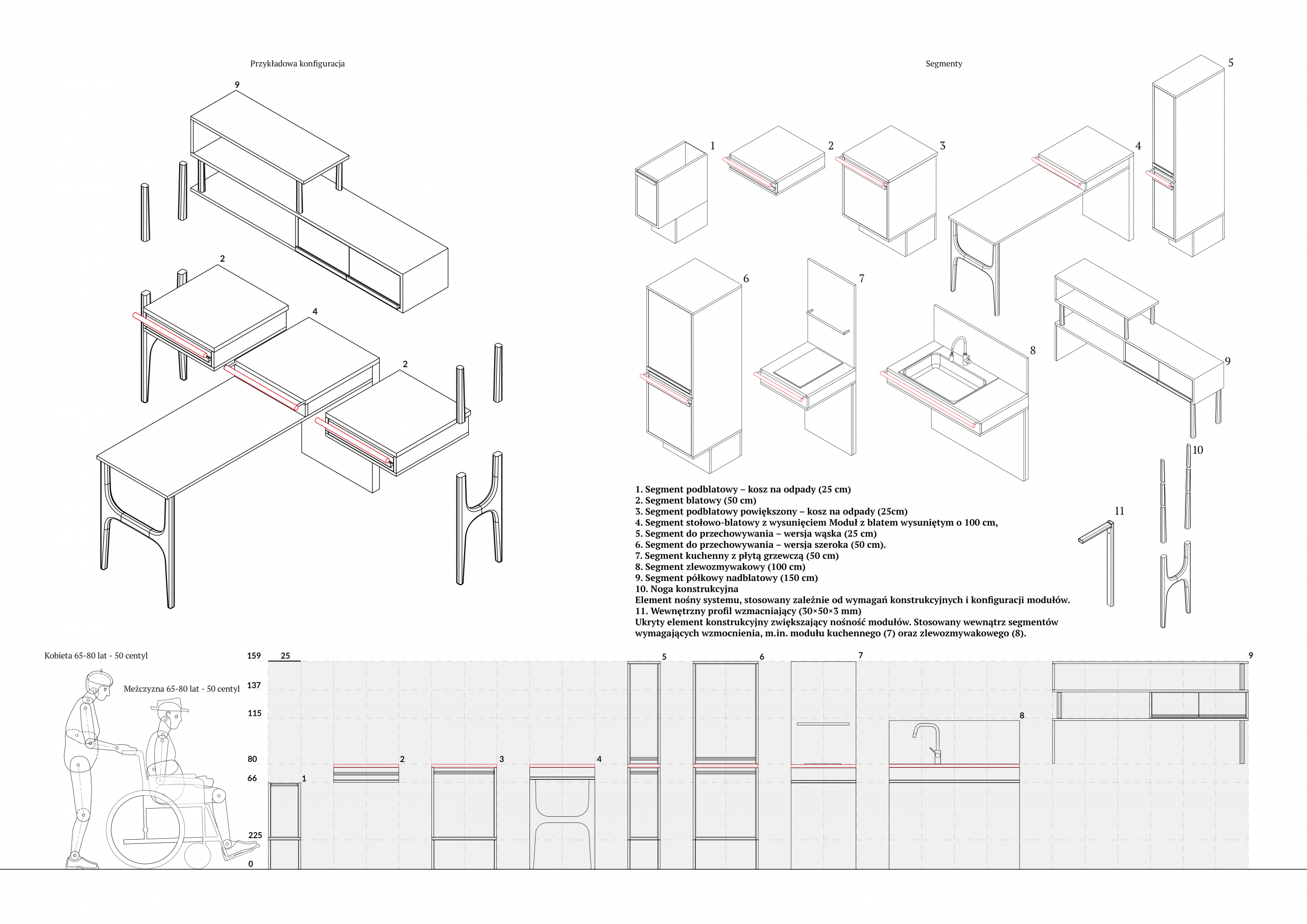 Projekt przeznaczony jest dla osób starszych oraz osób z dysfunkcjami ruchu, w tym użytkowników wózków inwalidzkich. Jego głównym celem było połączenie funkcji przygotowywania prostych posiłków z tworzeniem przestrzeni sprzyjającej kontaktom społecznym. Kluczowymi założeniami projektu były bezpieczeństwo użytkowników oraz niestygmatyzująca estetyka, umożliwiająca komfortowe i samodzielne korzystanie z przestrzeni kuchennej. Koncepcja opiera się na systemie dziesięciu modułów o zróżnicowanych funkcjach i wymiarach. Takie rozwiązanie pozwala na tworzenie wielu konfiguracji, dostosowanych do potrzeb oraz warunków przestrzennych obiektów wspólnych, również takich jak sanatoria czy szpitale rehabilitacyjne. Stylistyka projektu nawiązuje do estetyki młodości obecnych seniorów, budując atmosferę znajomą i przyjazną, a jednocześnie odpowiadającą współczesnym standardom wzornictwa. Projekt bazuje na typowej konstrukcji z płyty meblowej, co zapewnia trwałość oraz umożliwia jego wdrożenie do produkcji seryjnej.