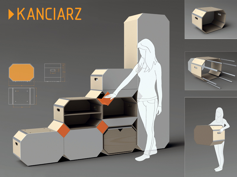 Moduł został zaprojektowany tak, aby łatwo było go składać w całość, bez zbędnych śrub lub kołków. Sklejka w trzech różnych wielkościach, łączona jest profilem aluminiowym. W bocznych ściankach znajdują się otwory pełniące funkcję uchwytów, co znacznie ułatwia przenoszenie modułów. Kanciarz to nie tylko zwykłe moduły, to także szereg funkcjonalnych wkładów, które dobieramy wedle własnych potrzeb. Występują one w postaci szuflad płytkich (na rzeczy drobne), szuflad głębokich (na ubrania i większe przedmioty), między modułowej szufladki (na płyty CD, drobiazgi), półek (na książki i gazety), szafek i pufo - skrzyni ( na większe przedmioty lub brudną odzież). Całość zestawu może dopełnić szafa, która pomieści zarówno ubrania na wieszakach, jak i większe przedmioty typu: plecaki, torby, drobny sprzęt sportowy.