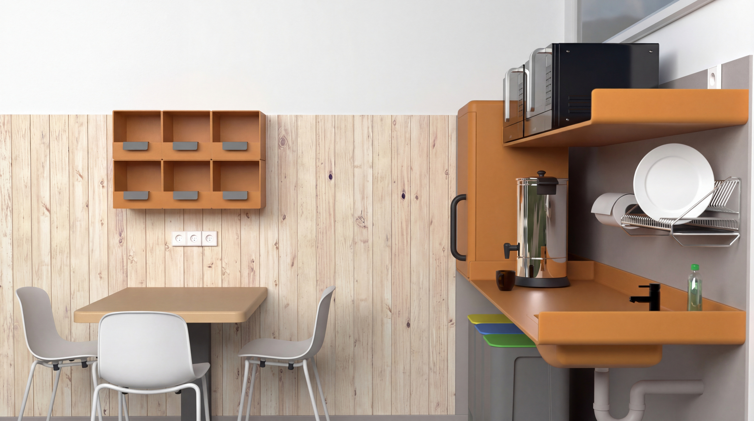 Celem jest: poprawa higieny, komfortu oraz kultury wspólnego posiłku w trudnych realiach placu budowy. Wyposażenie wnętrza zostało zaprojektowane
