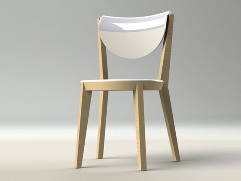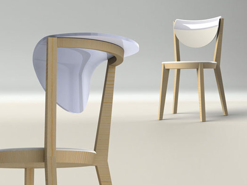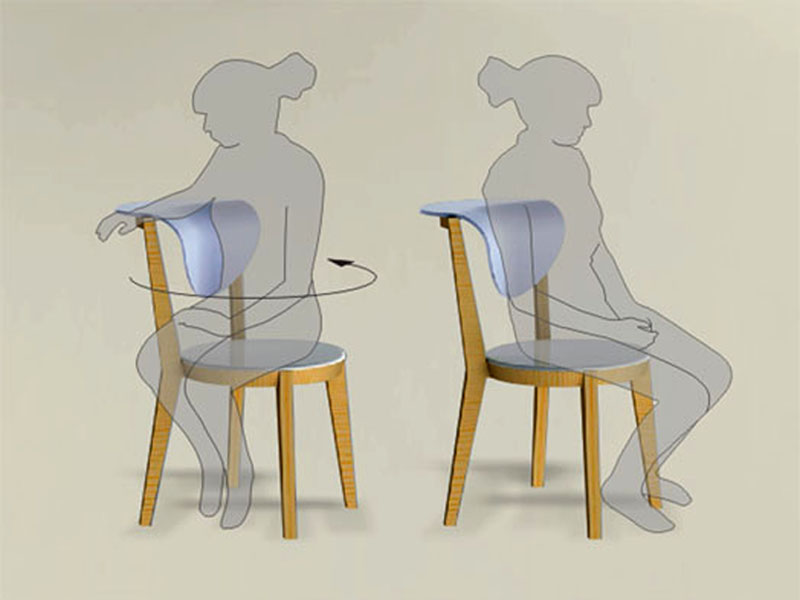 Oparcie krzesła zostało ukształtowane tak by maksymalnie wykorzystać właściwości materiału- sklejki. Zostało podzielone na dwie części: pierwsza zapewnia wygodne podparcia pleców (sprężystość sklejki), natomiast druga charakterystyczna dla projektu półka daje wsparcie osobie starszej (wykorzystując metodę piętrzenia przy wstawaniu).
