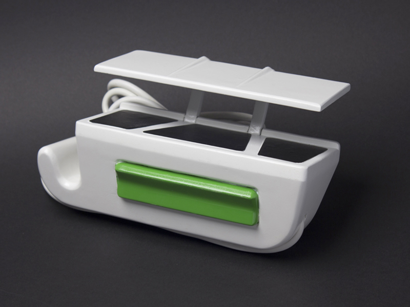 Stanowisko składa sie z blatu, stelaża oraz półek. Standardowo jedna półka wyposażona jest w gniazda elektryczne, dzięki którym dostęp do zasilania komputera jest „na wyciągniecie ręki". Półki można zdemontować - w tym celu wystarczy nieco je unieść. Stelaż wykonany jest z giętych rurek stalowych, wewnątrz których poprowadzono przewody zasilające gniazdka. Rozsuwany blat o kształcie fragmentu koła, to rozwiązanie dla tych, którzy czasem potrzebują nieco więcej miejsca na powierzchni biurka. Po wysunięciu blatu otrzymujemy o mniej więcej 60 procent większą powierzchnię do pracy.