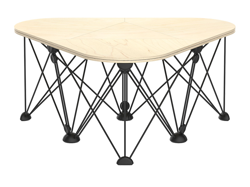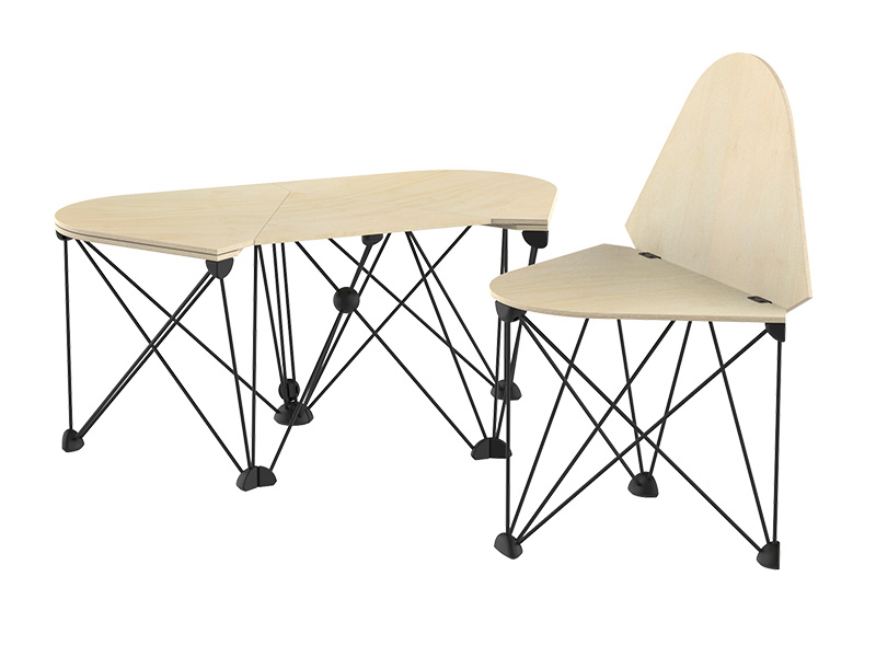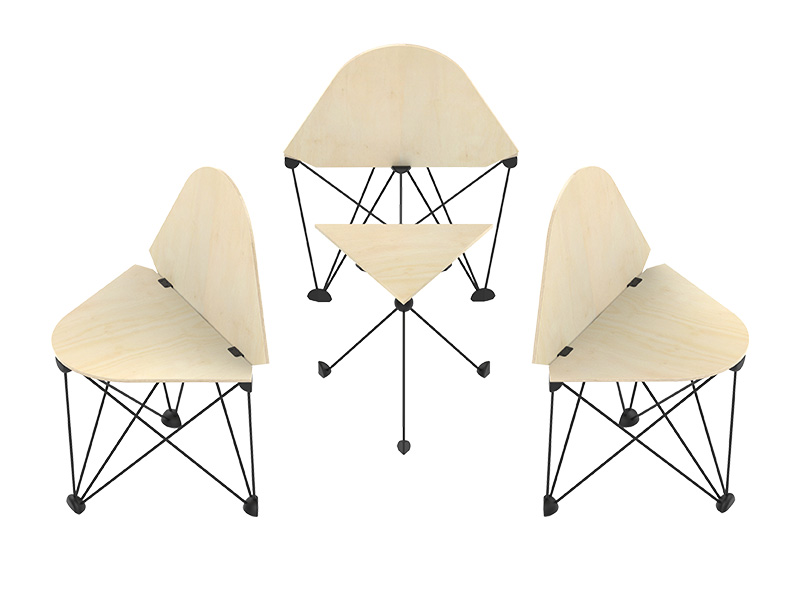 Komplet składa się z czterech modułów - trzy z nich to krzesła, zamieniane w stolik przez złożenie oparcia (złożone oparcie z siedziskiem daje część blatu stolika) i ustawienie w odpowiednim układzie. Czwarty element jest małym stolikiem umieszczanym pośrodku zestawu. Na co dzień „Lotka" funkcjonuje „w centrum życia", służąc jako stolik