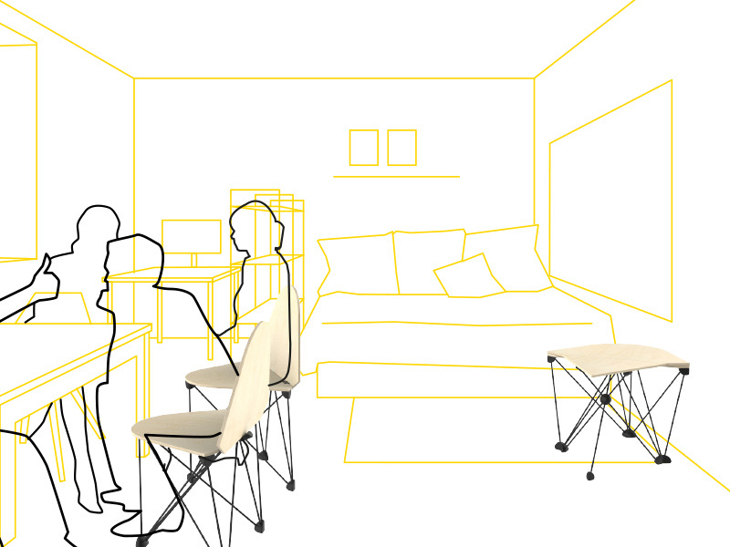 W małych mieszkaniach każdy centymetr jest na wagę złota. Aby skuteczniej wykorzystać tak ograniczoną przestrzeń powstał projekt mebla „Lotka", który w zależności od potrzeby ma dwie różne funkcje: jest ławą lub zestawem prostych krzeseł.
