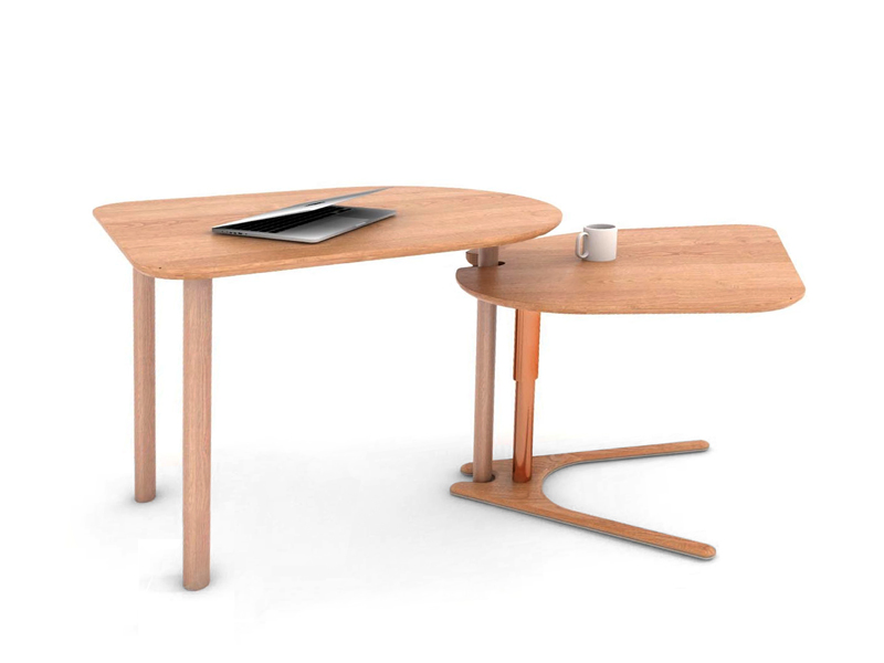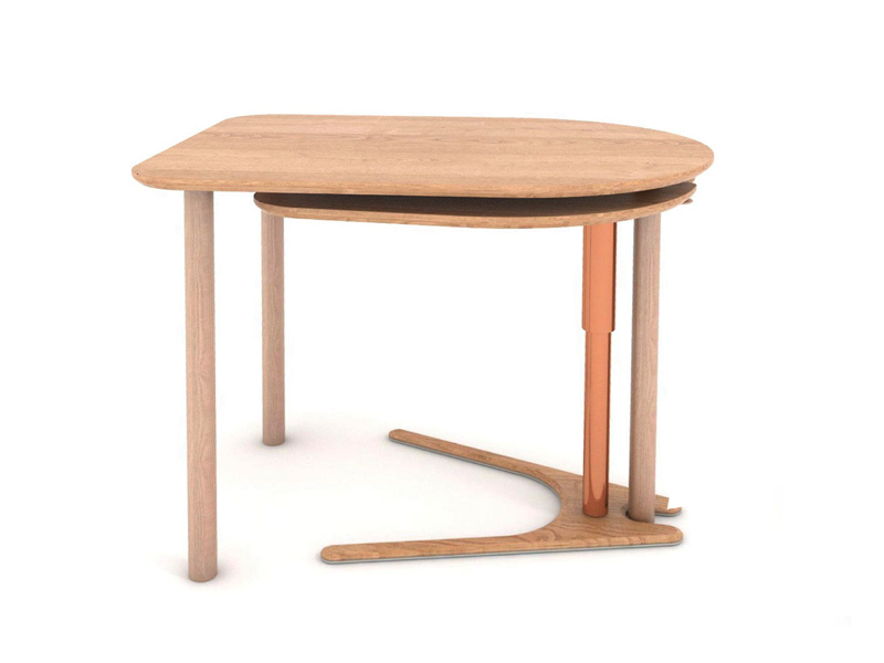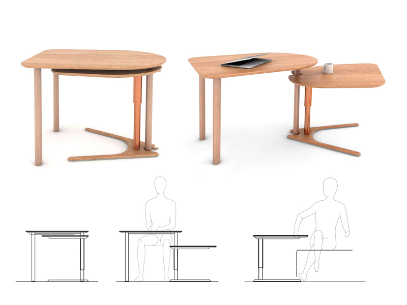 Stolik dostosowany jest do nowych potrzeb pokolenia współczesnych nomadów. Tworzą go dwa blaty odpowiadające innym funkcjom.Obracają sie wokół osi. Wyższy blat znajduje się na stałej wysokości 65 cm aby eliminować zgarbioną postawę ciała podczas jedzenia i pracy na kanapie w pozycji półleżącej. Blat ma wymiary 60x80 cm, które wynikają z potrzeb scenariusza użytkowego. Jest on miejscem spożywania posiłków oraz stanowiskiem pracy przy kanapie. Niższy blat opiera się na pojedynczej nodze. Dzięki zastosowaniu sprężyny gazowej blat jest regulowany. Minimalna wysokość stolika to 45 cm, a maksymalna to 60 cm. Użytkownik może korzystać z niego w symbiozie ze stolikiem wyższym oraz rozdzielnie. Blat ma wymiary 60x60 cm, aby pomieścić laptopa oraz kubek z napojem. Użytkownik może używać go na najniższym poziomie jako standardowy stolik kawowy. Dzięki użyciu tylko jednej nogi, stolik może być dosunięty do łóżka lub sofy. Stoliki można złączyć w jeden. Niższy ze stolików może obracać się wokół osi. Użytkownik tym samym zwiększa powierzchnię blatu.