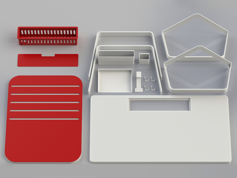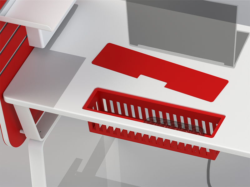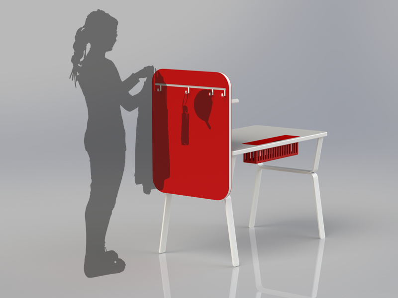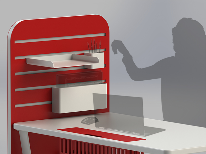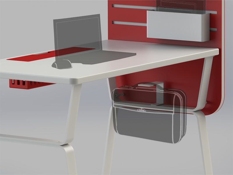Mebel zaprojektowany został do przestrzeni coworkingowych. Dedykowane jest dla osób z branży kreatywnej, pracujących indywidualnie. Stanowisko dostosowane jest do prac zarówno chwilowych jaki i wielogodzinnych. Na całość składają się: biurko oraz montowana do niego ścianka działowa. Zewnętrzna jej część służy do odwieszania odzieży, natomiast strona wewnętrzna do przechowywania akcesoriów niezbędnych do pracy. System wcięć umożliwia montaż poszczególnych elementów: pojemniki na przybory, dokumenty i notatki oraz półkę służącą do odkładania posiłków i niewielkich rzeczy. Użytkownik ma możliwość zmiany umiejscowienia elementów zgodnie z własnymi potrzebami poprzez przesuwanie i przewieszanie, dzięki temu blat roboczy jest wolny od zbędnych przedmiotów. Pod nim zostało przewidziane miejsce na odwieszenie plecaka lub teczki oraz pojemnik na przedłużacz i okablowanie. Uniwersalne mocowania ścianki pozwala na jej montaż po prawej lub lewej stronie blatu. Projekt powstał przy współpracy z Instytutem Socjologii Uniwersytetu Jagiellońskiego (Oleksandra Smolentseva - studentka pod opieką dr E. Kopczyńskiej). Projekt uwzględnia możliwości technologiczne fabryki mebli Fornit z Jaworzna.