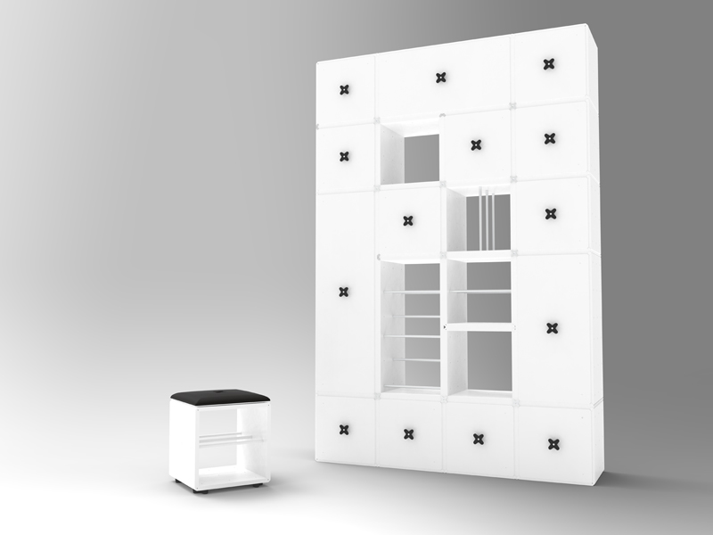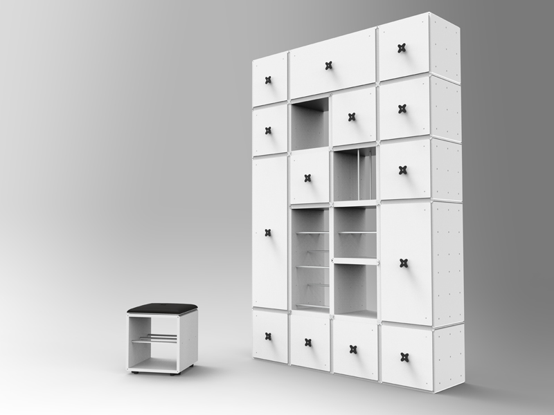 Modułowy system mebli XOXO został zaprojektowany z myślą o dynamicznie zmieniających się układach mieszkań. To również rozwiązanie braku miejsca do przechowywania rzeczy codziennych w mieszkaniach o małym metrażu. Każdy z elementów systemu można wykorzytać na kilka różnych sposobów, tworząc nie tylko przestrzeń przechowującą, ale również użytkową. Uniwersalne moduły szybko przekształcją się z szafek i półek na stołki do siedzenia czy stoliki, nie tracąc przy tym funkcji przechowywania. Rezygncja z tynej płyty mebli a także rytm perforacji ścianek zapewniają cyrkulację powietrza i zapobiegają pleśnieniu. Dwustronność pozwala także na opcjonalne ustawienie systemu jako ścianki działowej. Konstrukcja pozwala na szybką reorganizację całego układu.