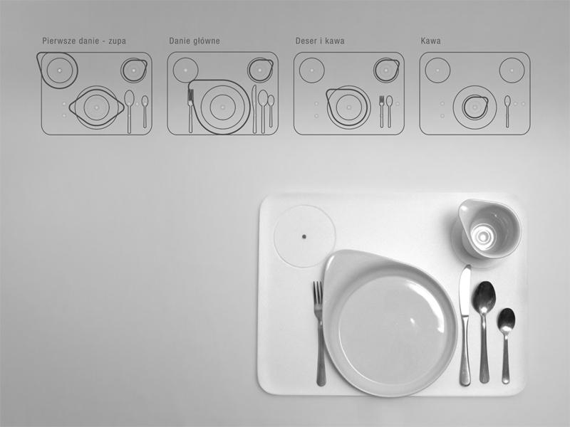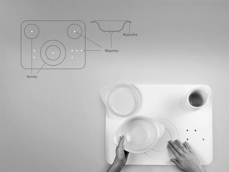 Naczynia mają przyjazne, płynne formy ściśle związane z funkcją. Wypustki (wydłużona, wygięta część brzegu naczyń) spełniają rolę punktu odniesienia, wyznaczając pozycje potraw na talerzu. Forma wypustki w naczyniach pozwala na pewny chwyt, wygodne przesuwanie i unoszenie. Uniesiona część brzegu talerza ułatwia zgarnianie, obniżona - dostęp do potrawy. Miska z dwoma wypustkami ułatwia dwuręczne, stabilne jej trzymanie i picie płynów (zupy) w sposób charakterystyczny dla osób niewidomych. Naczynia nie stygmatyzują osób niewidomych, są atrakcyjne dla innych użytkowników, co daje możliwość integracji rodziny przy wspólnym posiłku.