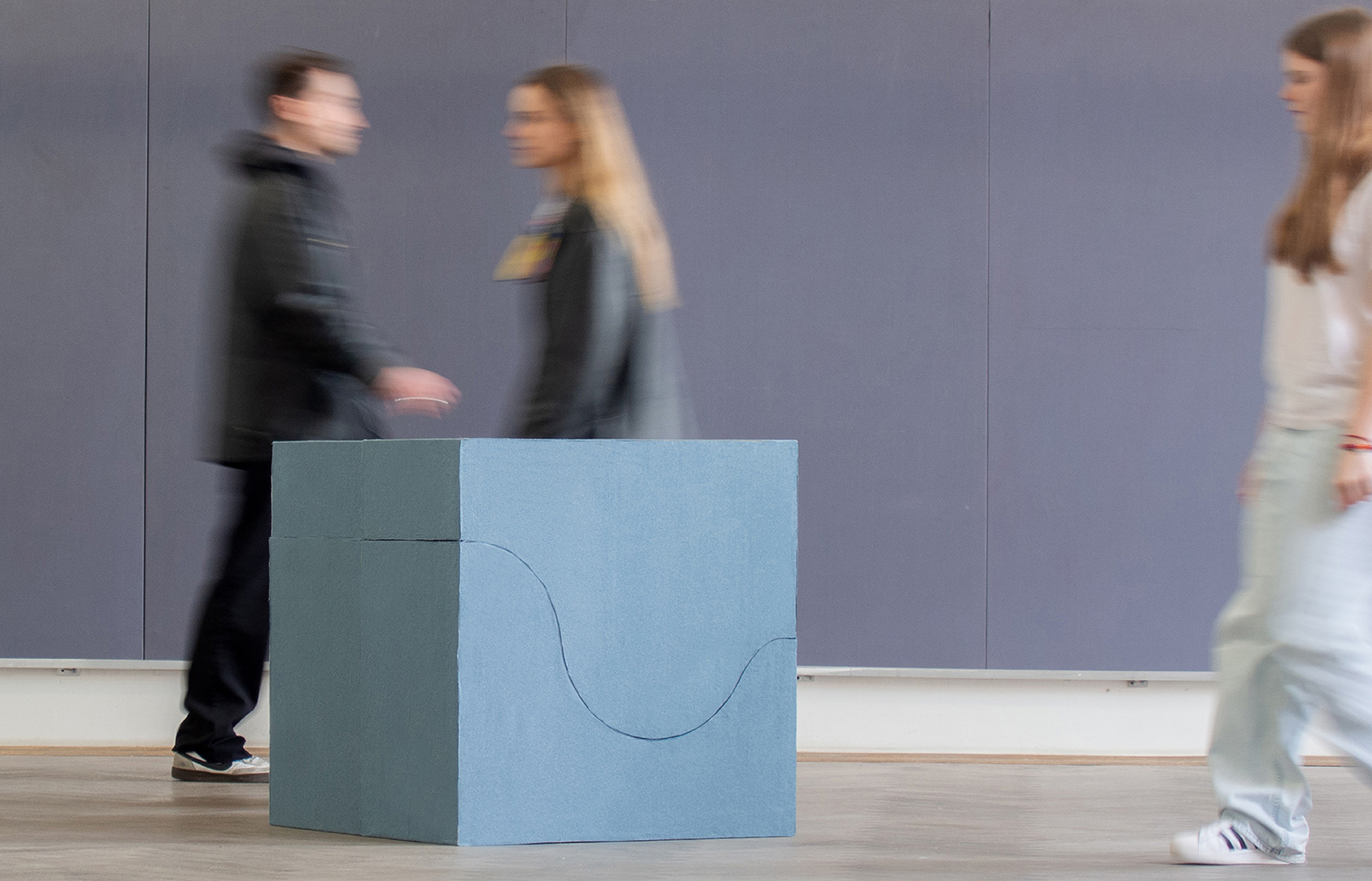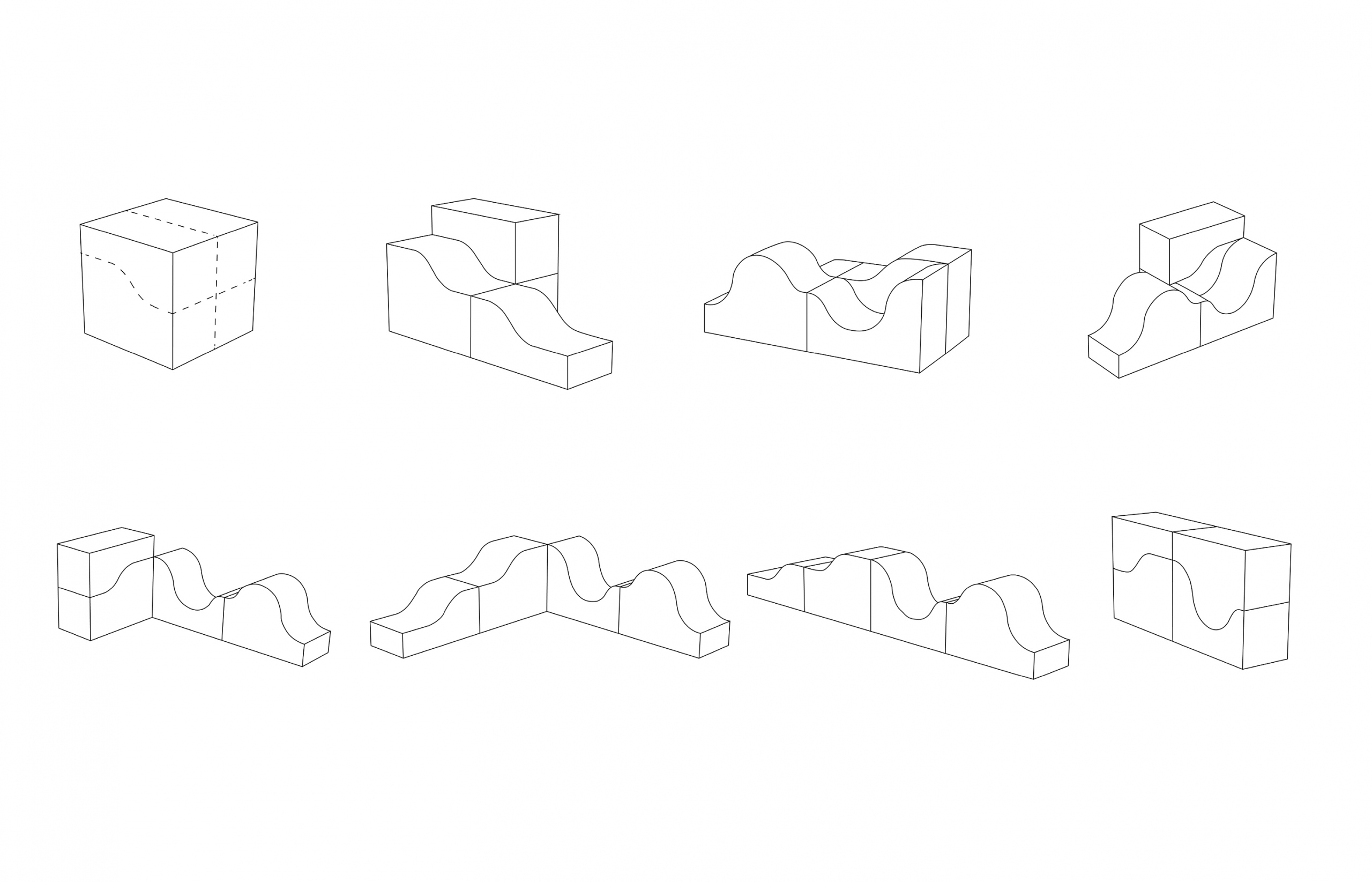 Projekt mebla dla szkół podstawowych stanowi odpowiedź na potrzebę uczniów poszukujących alternatywy dla tradycyjnych ławek na korytarzach, jednocześnie wspierając naturalne interakcje społeczne. Konstrukcja, oparta na formie sześcianu, składa się z czterech elementów połączonych w trzech punktach obrotu umieszczonych na krawędziach bryły, co umożliwia tworzenie różnorodnych konfiguracji o zmiennych układach i długościach. Dzięki płynnej, organicznej linii forma nie narzuca sposobu użytkowania – przeciwnie, zaprasza do swobodnego wyboru pozycji, ich zmienności oraz zachęca do spontanicznych interakcji między dziećmi. Lekka konstrukcja umożliwia samodzielne przesuwanie i składanie elementów przez uczniów, co sprzyja elastycznemu wykorzystaniu przestrzeni. Projekt został stworzony z myślą o zróżnicowanej architekturze szkolnej – sprawdza się zarówno w wąskich korytarzach, jak i otwartych strefach wspólnych. Może być ustawiany przy ścianie lub funkcjonować jako element wolnostojący, w zależności od potrzeb użytkowników, charakteru miejsca i chwili. Pokrycie mebla materiałem dźwiękochłonnym pozytywnie wpływa na akustykę otoczenia.