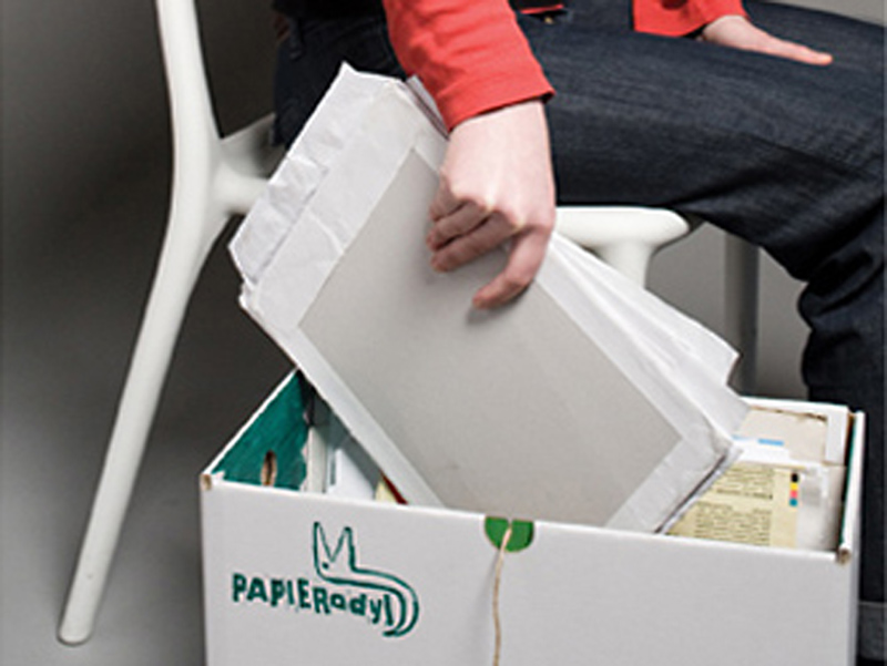 PAPIERodyl - kosz do segregacji papieru, którego forma inspirowana jest teczką - naturalnym miejscem przechowywania papieru. Kosz służy do gromadzenia makulatury (do formatu A4) w domu lub w biurze oraz umożliwia związanie jej w poręczny pakunek - kosz wyposażony jest w sznurek i nożyk. Skośne ściany sprzyjają samoporządkowaniu oraz w razie potrzeby przeglądaniu zawartości. Wysokość kosza dostosowana do wygodnego korzystania w pozycji siedzącej. Rozmiar kosza po złożeniu wynosi 210 x 335 x 395 mm. Wykonany jest z jednego arkusza tektury Falistej grubości 5 mm (fala „B+E"), techniką sztancowania. Składowany i transportowany na płasko.