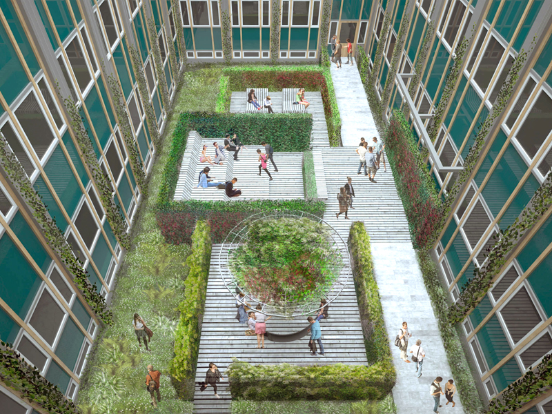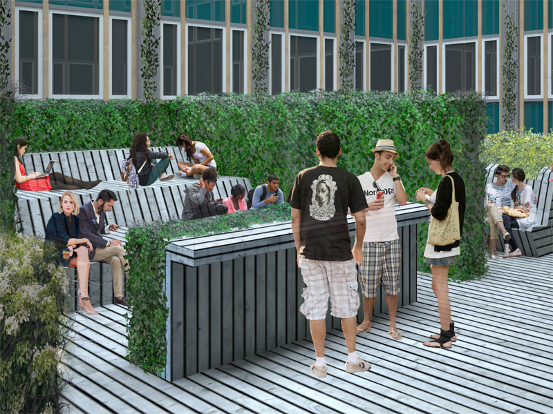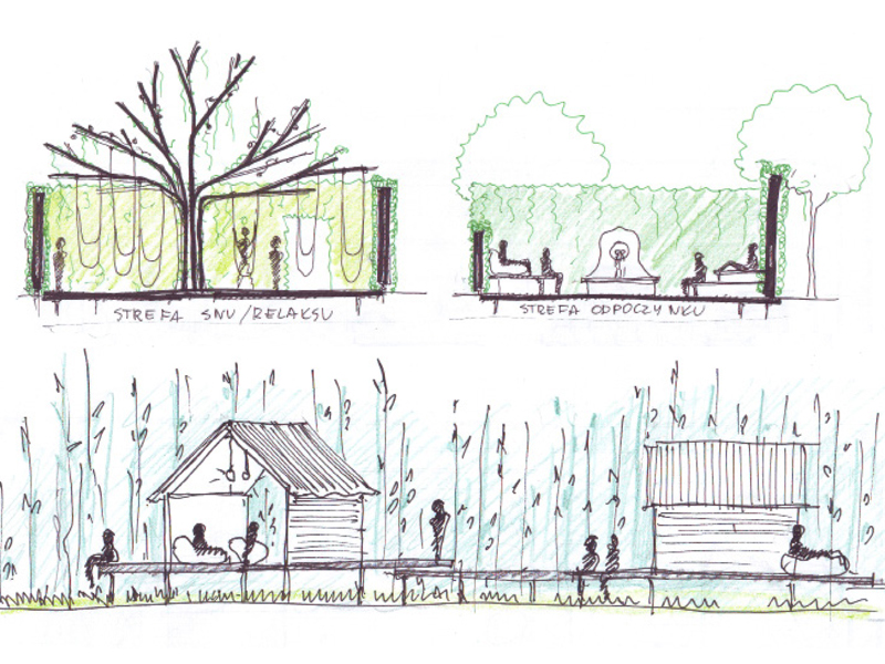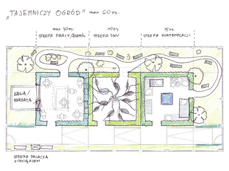 Koncepcja zagospodarowania nawiązuje do istniejącego układu architektonicznego i rysunku posadzki. Przyjęty moduł (3x3m) wynika z konstrukcyjnej siatki budynku oraz charakterystycznego podziału elewacji. W tym module opracowano trzy strefy funkcjonalne, oparte na kwadracie siatki (6x6m). Każda z nich jest wydzielona ścianami zieleni, które na poziomie percepcji człowieka, zmniejszają wrażenie „studni". Zieleń ta nadaje również intymnego charakteru powstałym przestrzeniom oraz zmniejsza pogłos miejsca. W pierwsza strefie, zadaszonej „zielonym parasolem" znajduje się stół do pracy, środkowa strefa to mini-amfiteatr przeznaczony do wypoczynku lub okazjonalnych imprez. Ostatnia strefa, najbardziej nasłoneczniona, pozwala na maksymalny relaks w pozycjach leżących i półleżących. Wszystkie elementy siedzisk i posadzka stref zostały zaprojektowane w technologii drewnianego tarasu na podwyższeniu, zabezpieczonego przed warunkami atmosferycznymi (wykończenie z desek bankiraj).