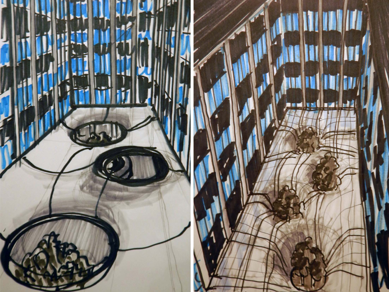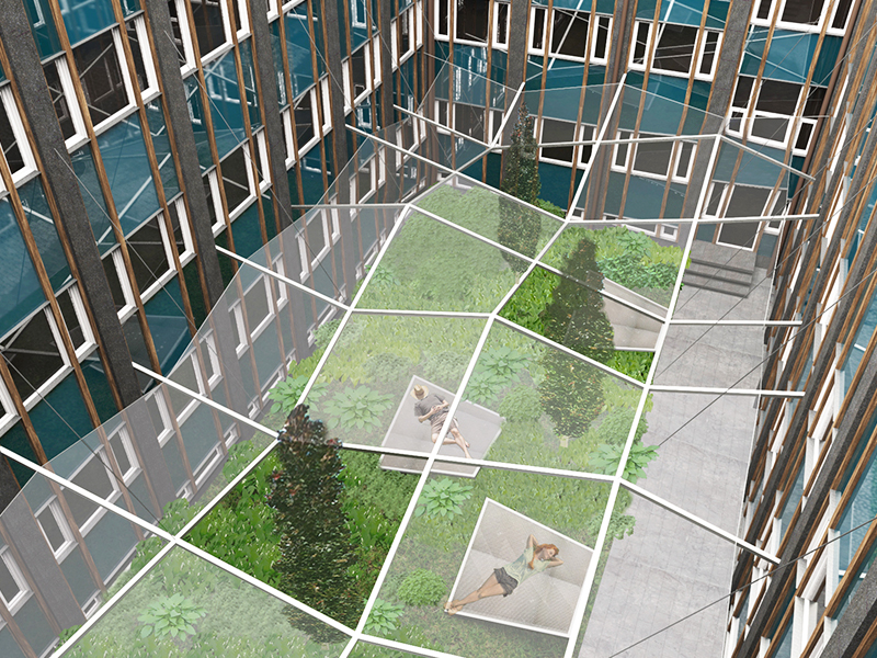 Projekt patio opiera się na częściowym zadaszeniu przestrzeni, koncepcja stanowi kontrast do funkcjonalistycznej architektury budynku. Lekki, przeźroczysty dach wykonany z folii ETFE, oparty na metalowej konstrukcji daje schronienie podczas opadów i wygłusza dźwięk. Jego forma kieruje wody opadowe do trzech otworów. Konstrukcja podzielona jest na prostokątne moduły, które zostały powtórzone w dolnej części patia w formie leżanek. Służą one do wypoczynku w pozycjach od siedzącej do leżącej. Wykonane są z siatki rozciągniętej na stalowej konstrukcji. Pod zadaszeniem znajduje się ogród zapachowy. Konwalie i krzewy mięty pomagają odprężyć się i zregenerować. Trzy buki kolumnowe wyrastają ponad zadaszenie, znajdując miejsce w zaplanowanych otworach. Obok ogrodu przechodzi ścieżka z kamiennych płyt, łącząca dwa wejścia do patio.