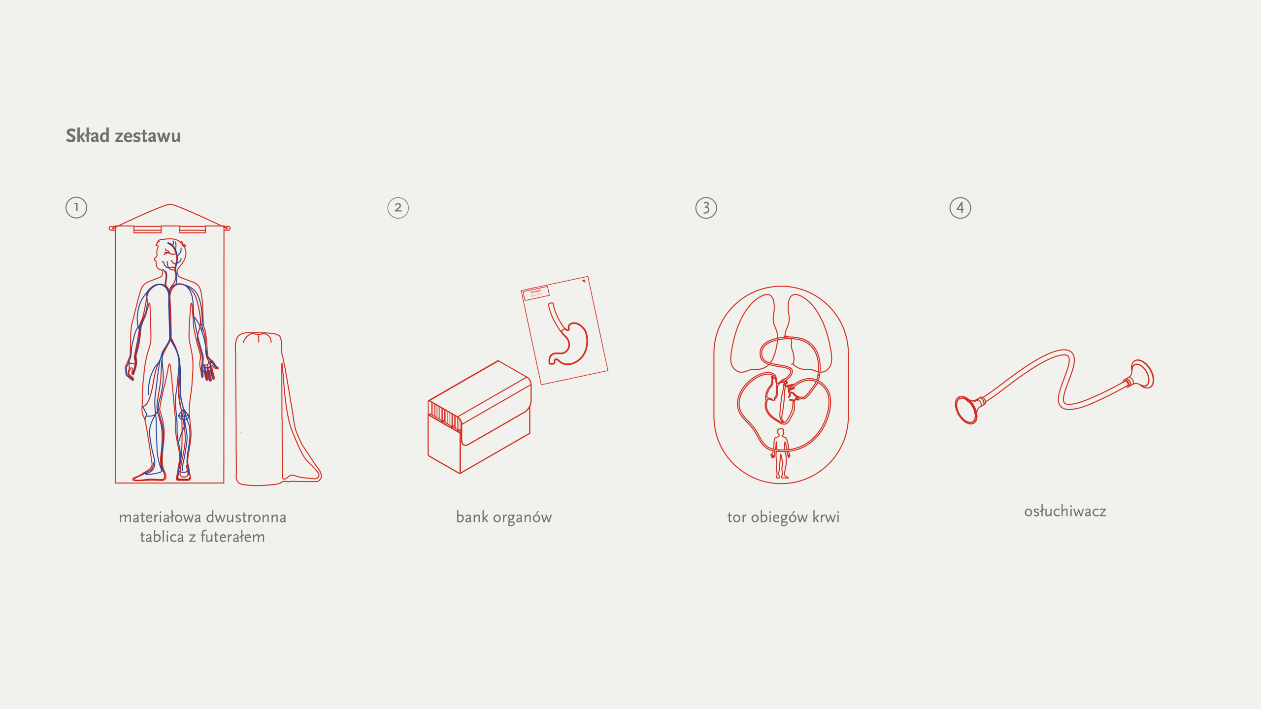 Finalne rozwiązanie jest skoncentrowane wokół wyznaczonego schematu posłuchaj – poznaj – zrozum. Składa się ono z elementów : osłuchiwacza, materiałowej tablicy z człowiekiem, banku narządów, toru obiegów krwi.