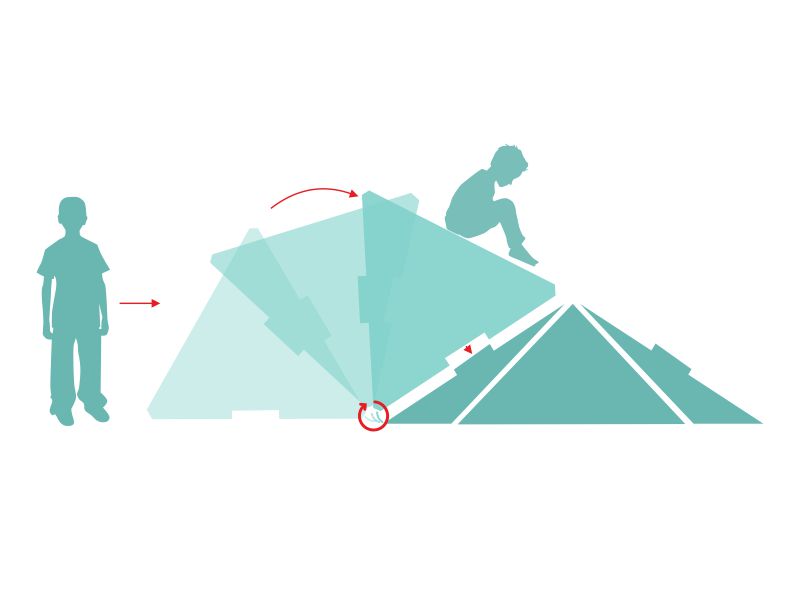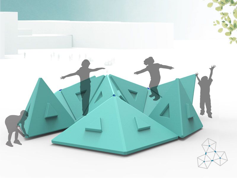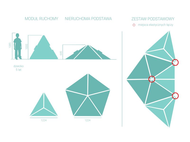 Ideą placu zabaw jest włączenie dzieci w projektowanie i budowanie własnej przestrzeni do zabawy. Podstawowy zestaw to nieruchoma podstawa oraz trzy moduły w kształcie ostrosłupów. Elastyczne łącze wychodzące z jednego wierzchołka każdej bryły daje możliwość wielu zmian ich położenia. Ruchome elementy zachęcają do kreatywności, rozwoju zabaw twórczych i konstrukcyjnych oraz rozwoju zdolności manualnych. Ostrosłupy są o wysokości zbliżonej do pięcioletniego dziecka. Duży rozmiar modułów ma na celu zwiększenie interakcji społecznych oraz współpracę dzieci. Dodatkowo daje poczucie satysfakcji z tworzenia własnej małej architektury. Plac zabaw można rozbudowywać dodając do siebie kolejne zestawy. Prosta forma ma inspirować dzieci do różnorodnych aktywności fizycznych a przede wszystkim do swobodnej i twórczej zabawy. Współpraca ze studentami Uniwersytetu Jagiellońskiego pod opieką prof. Halszki Ogińskiej.