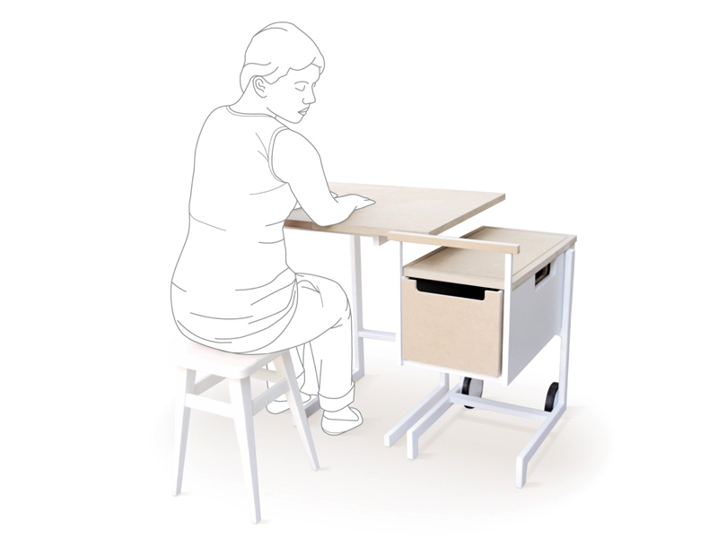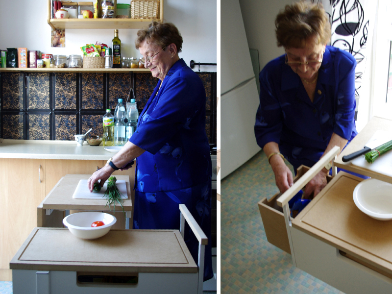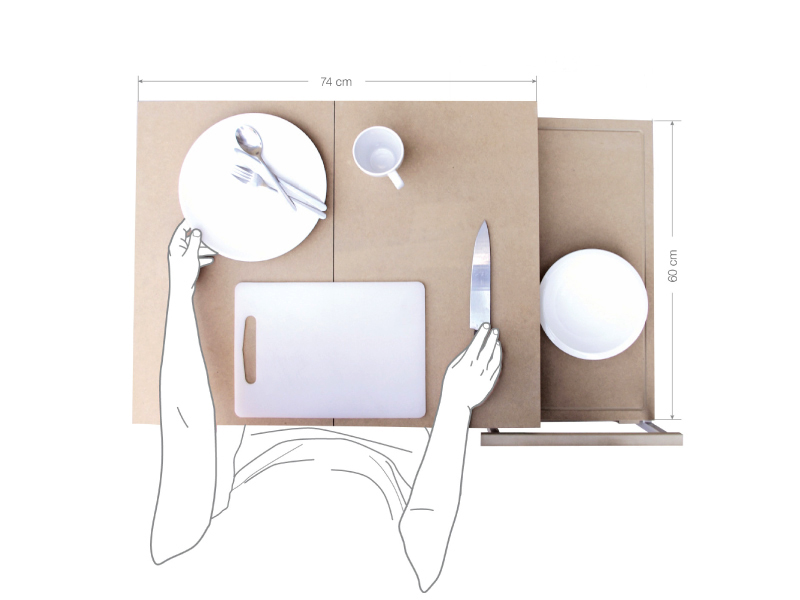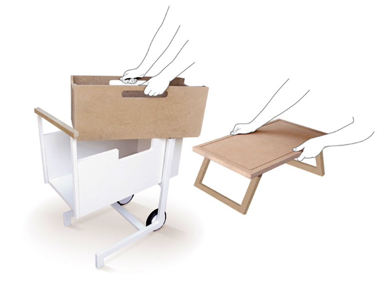 Rozkładane, mobilne miejsce pracy o niewielkich gabarytach zostało zaprojektowane z myślą o małych kuchniach oraz aneksach kuchennych. Składa się z dwóch modułów: stołu pozwalającego na wykonywanie dodatkowych czynności w kuchni, jak: jedzenie, czytanie, szycie oraz wózka z tacką umożliwiającego przechowywanie podręcznych przedmiotów i podawanie posiłku do łózka.