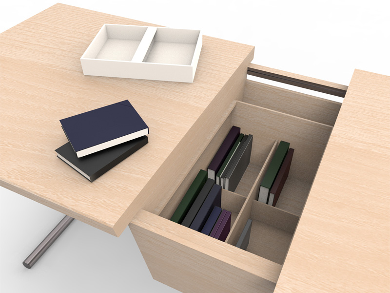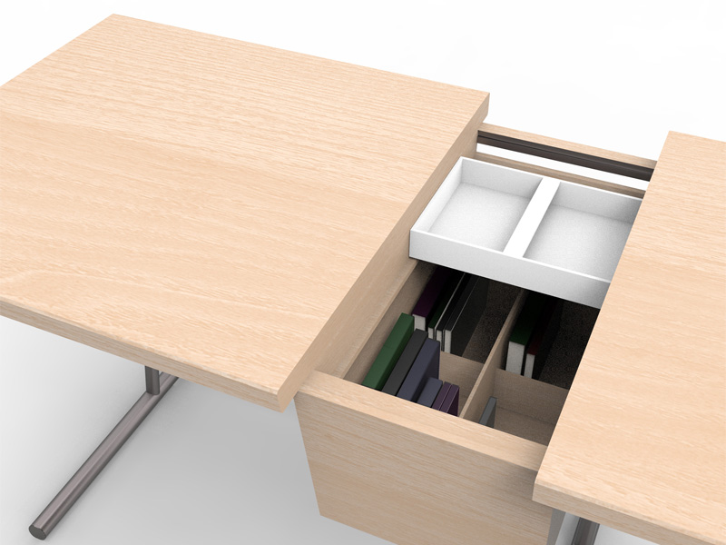 Biurko dla uczniów "rośnie" wraz z użytkownikiem - umożliwia regulację wysokości blatu i głębokości przestrzeni na nogi. Rozsuwany blat zapewnia dostęp do przesuwnej przegródki na przybory biurowe oraz znajdującej się pod nią szafki na zeszyty i podręczniki. Są one ustawione do góry grzbietem i pod lekkim kątem w stronę użytkownika, przez co można je łatwiej odnaleźć i wyciągnąć. Tylna część szafki zawiera specjalną przestrzeń na uporządkowanie kabli oraz zamontowanie listwy elektrycznej. Ograniczenie przestrzeni do przechowywania oraz gabarytów samego blatu zapobiega tworzeniu się bałaganu, motywuje użytkownika do lepszej organizacji miejsca pracy, a w konsekwencji poprawia jego koncentrację.