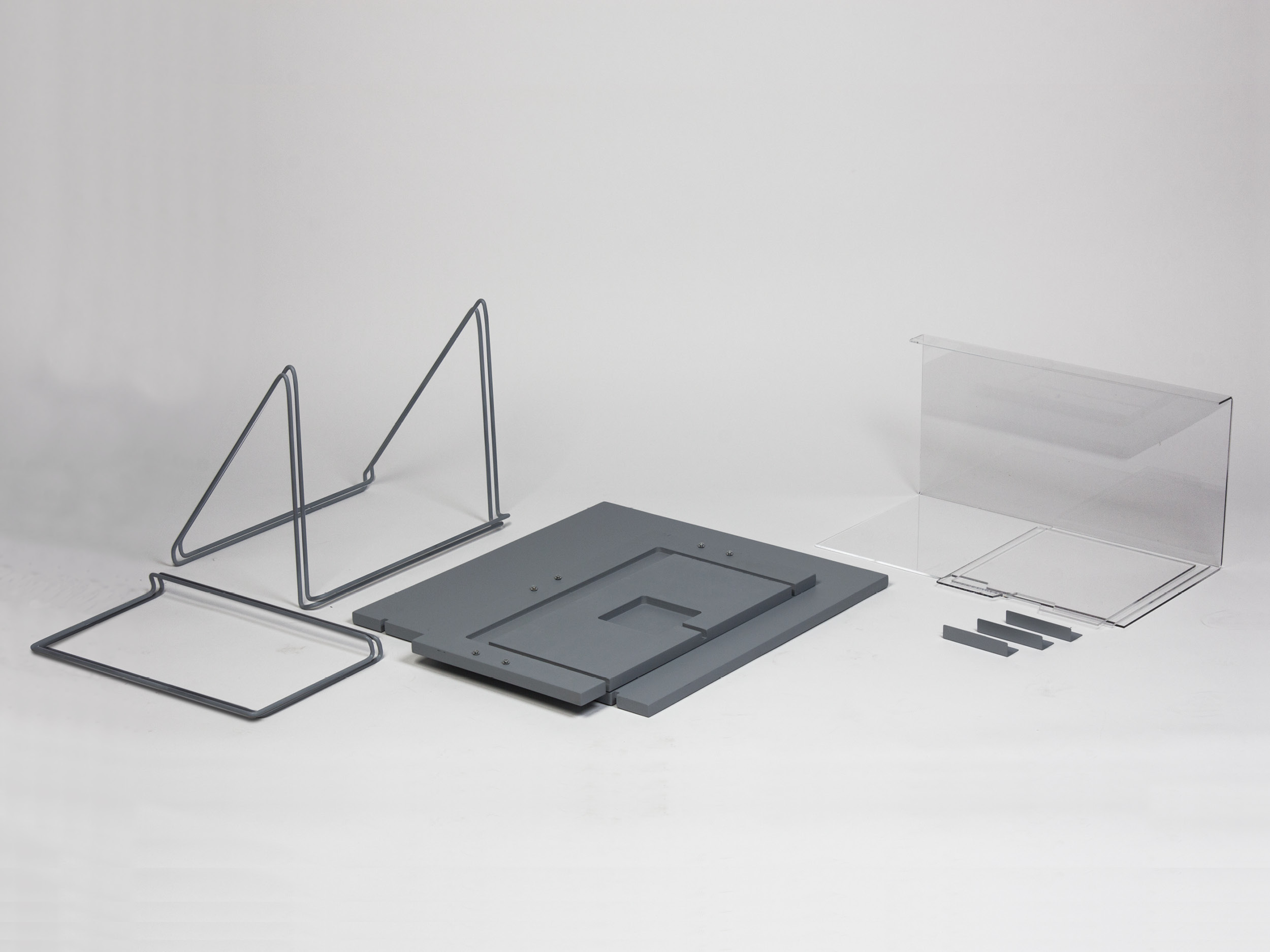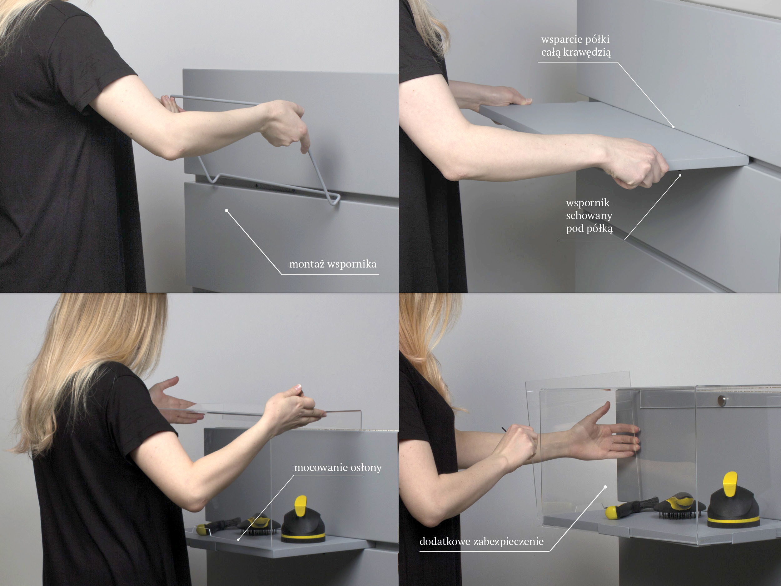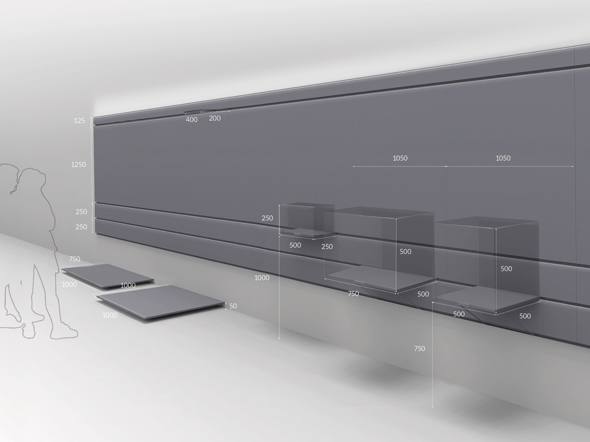 System GS jest modernizacją istniejącego sposobu ekspozycji w Galerii Schody. Głównym założeniem jest opracowanie wizualnie neutralnego ekspozytora umożliwiającego prezentowanie małych średnich i dużych modeli (możliwość podwieszania) a także łatwe zawieszanie plansz i materiałów oprawionych w ramy. Przyjęty moduł 50 x 50 cm wpisuje się w graficzny motyw płytek podłogowych. Ekspozytory zbudowane są z metalowych paneli montowanych do ściany. Szczeliny między panelami pozwalają na łatwy i szybki montaż półek oraz transparentnych osłon, również z możliwością całkowitego zabezpieczenia eksponatów. Półki montowane są na podporach z zagiętych stalowych prętów, które służą również do podwieszania modeli. Plansze montowane są za pomocą haczyków, magnesów lub listew. Dla dużych eksponatów przewidziano niskie postumenty o dwóch wielkościach. Zestaw daje stosunkowo duże możliwości różnego rodzaju aranżacji. Wszystkie elementy ruchome, w trakcie przechowywania zajmują niewielki gabaryt.