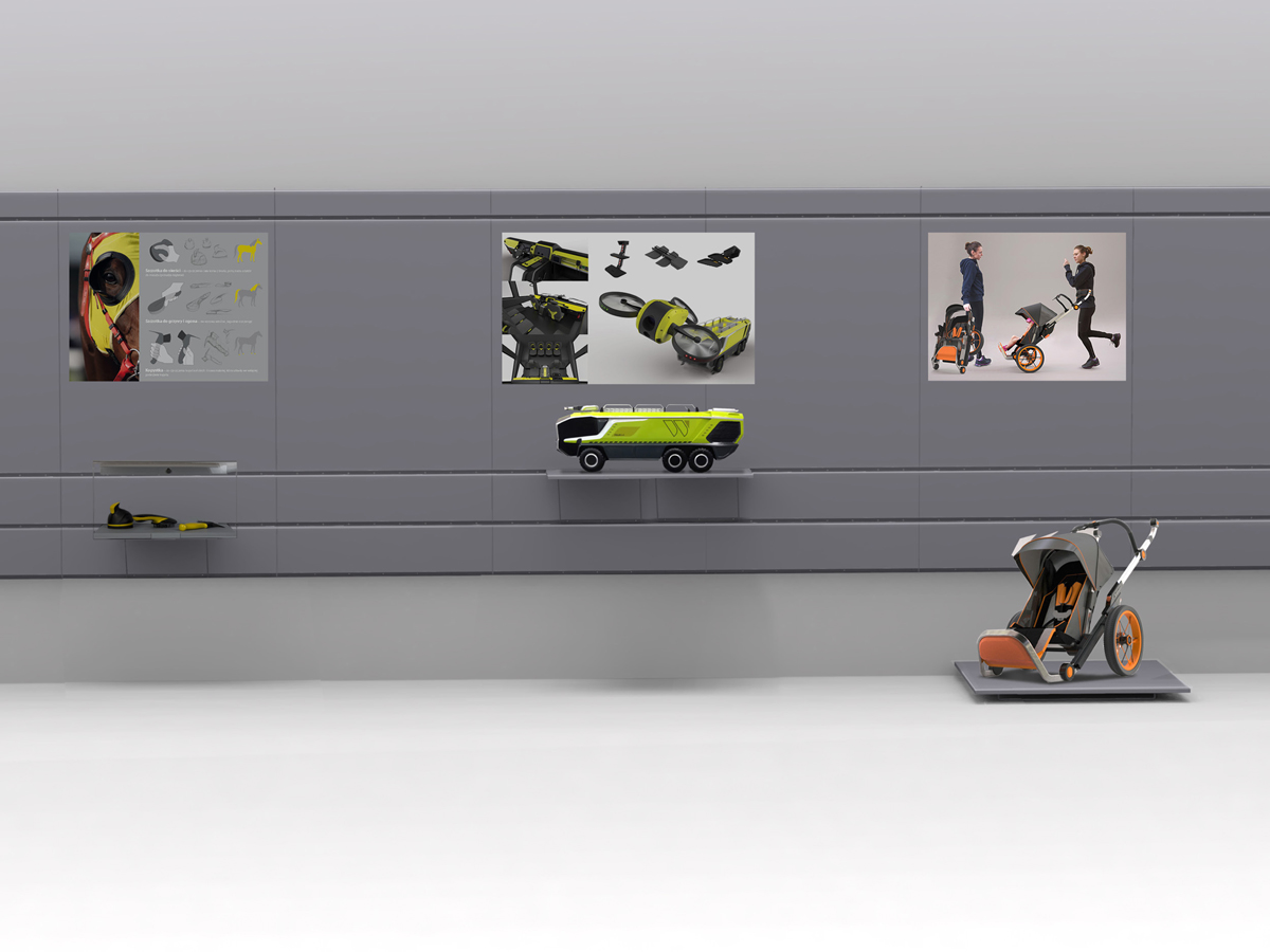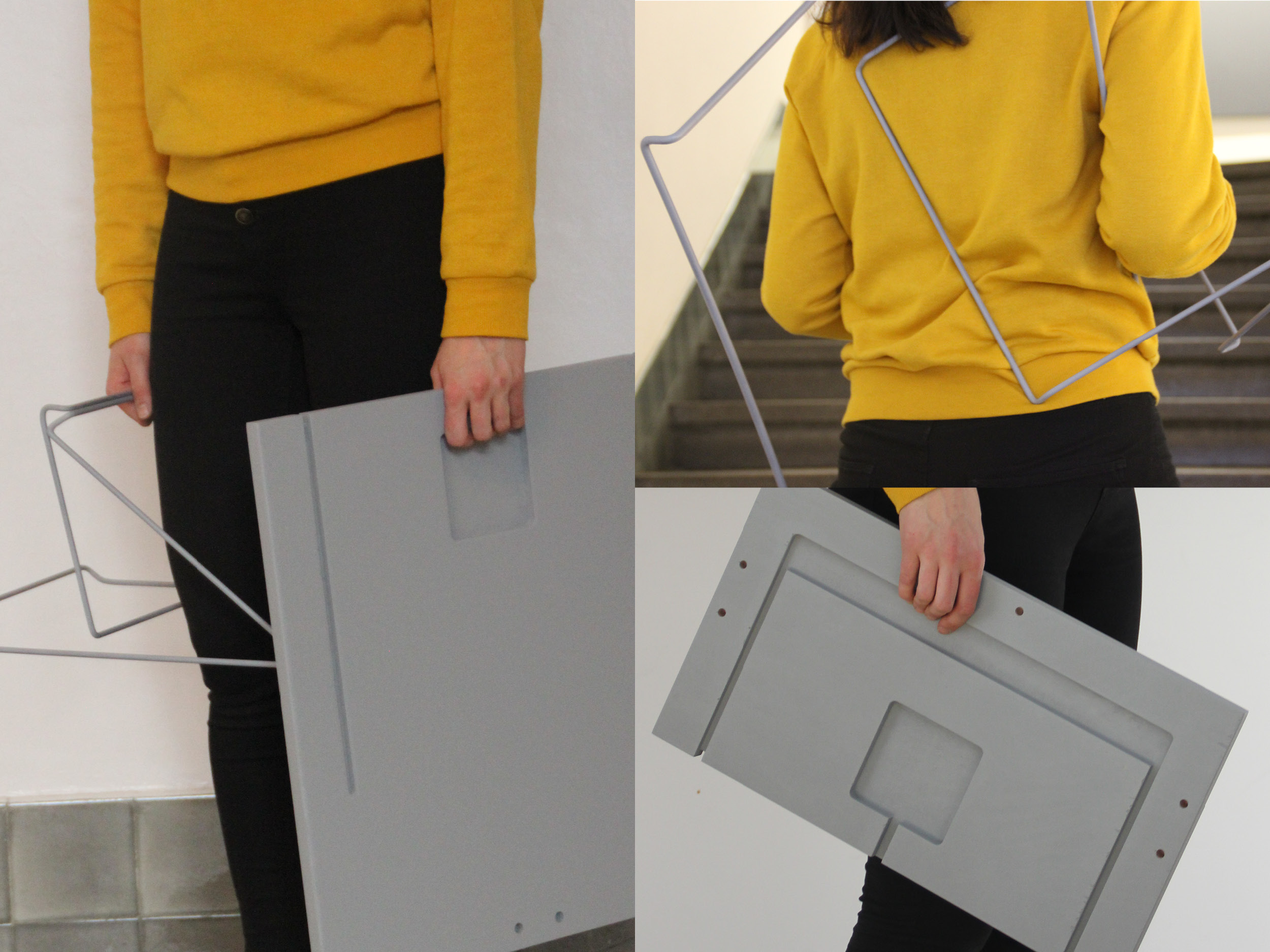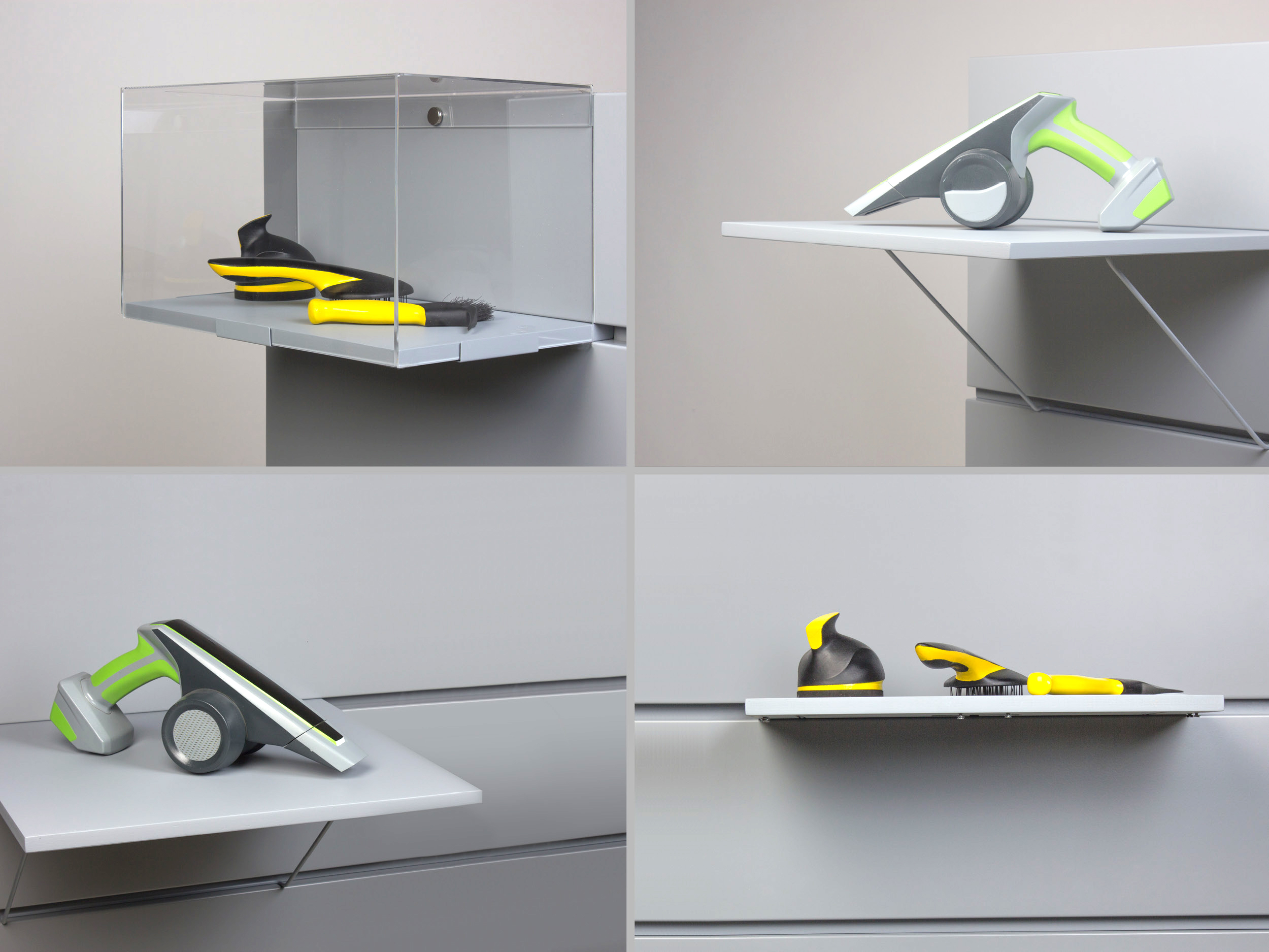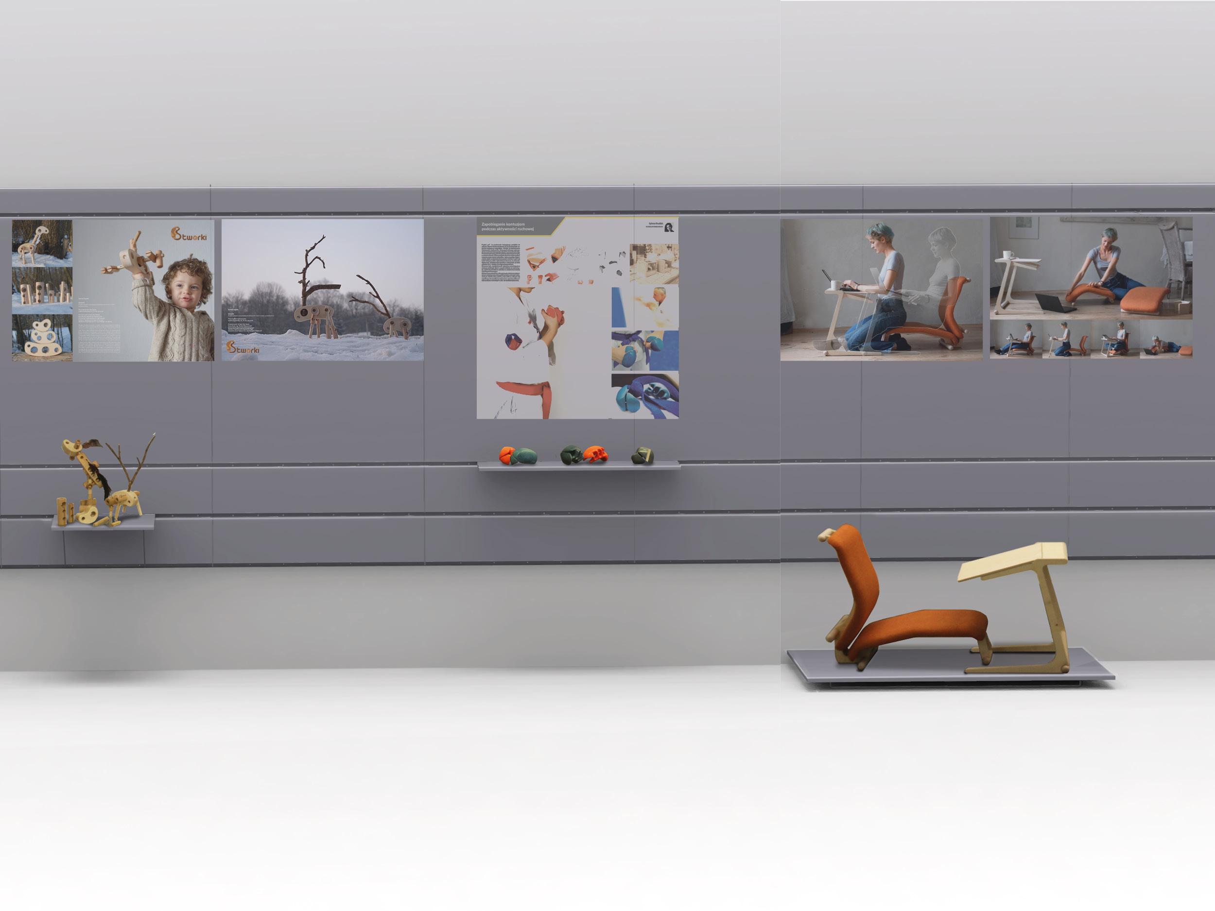 System GS jest modernizacją istniejącego sposobu ekspozycji w Galerii Schody. Głównym założeniem jest opracowanie wizualnie neutralnego ekspozytora umożliwiającego prezentowanie małych średnich i dużych modeli (możliwość podwieszania) a także łatwe zawieszanie plansz i materiałów oprawionych w ramy. Przyjęty moduł 50 x 50 cm wpisuje się w graficzny motyw płytek podłogowych. Ekspozytory zbudowane są z metalowych paneli montowanych do ściany. Szczeliny między panelami pozwalają na łatwy i szybki montaż półek oraz transparentnych osłon, również z możliwością całkowitego zabezpieczenia eksponatów. Półki montowane są na podporach z zagiętych stalowych prętów, które służą również do podwieszania modeli. Plansze montowane są za pomocą haczyków, magnesów lub listew. Dla dużych eksponatów przewidziano niskie postumenty o dwóch wielkościach. Zestaw daje stosunkowo duże możliwości różnego rodzaju aranżacji. Wszystkie elementy ruchome, w trakcie przechowywania zajmują niewielki gabaryt.