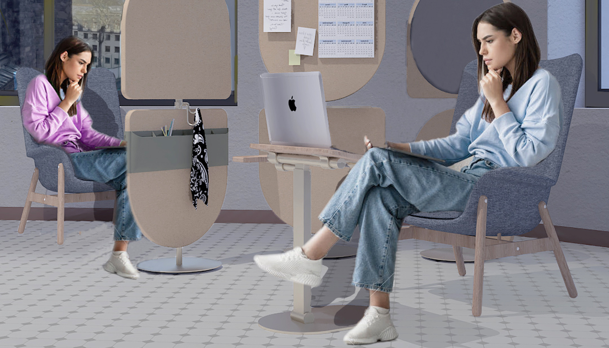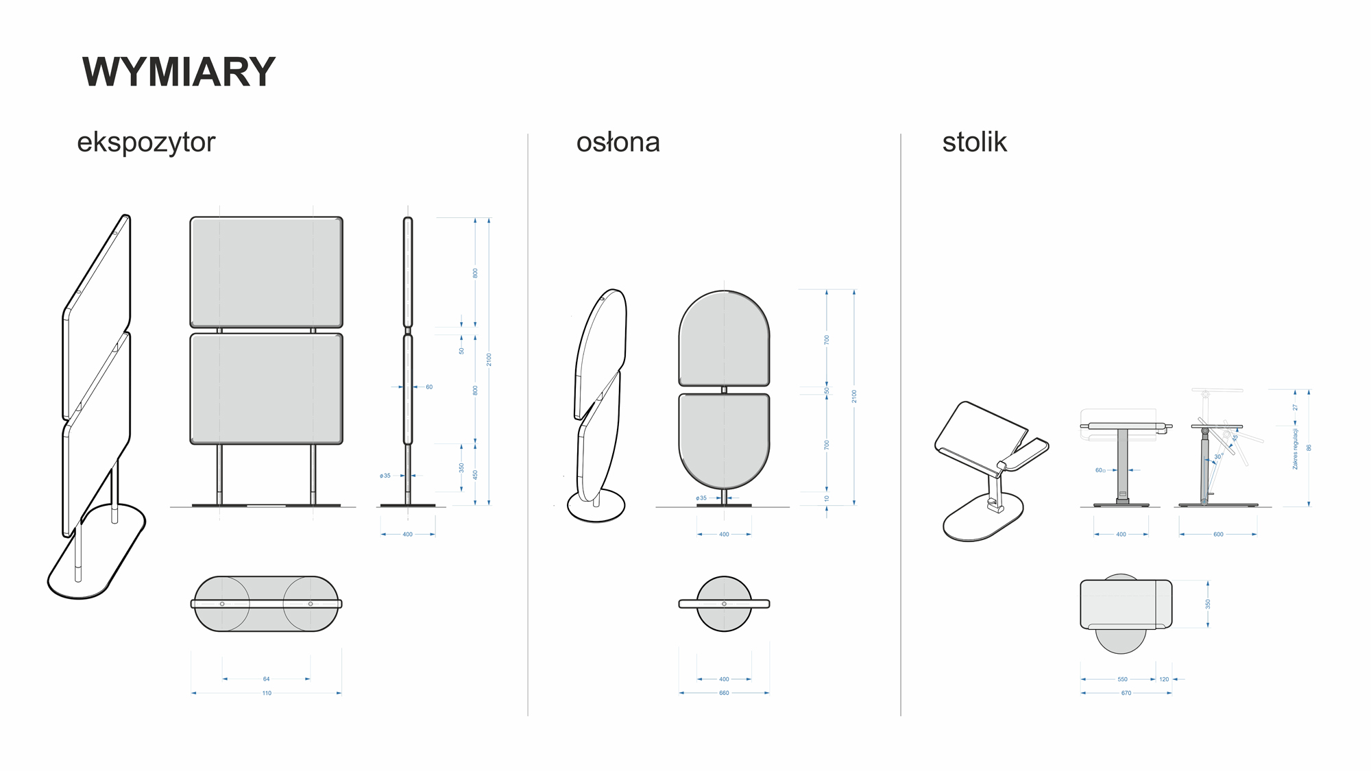 W odpowiedzi na te problemy zaprojektowałam zestaw mebli, który poprawiłby jakość pracy i odpoczynku w tej przestrzeni. Zestaw ten składa się z parawanu wystawowego, parawanu codziennego oraz regulowanego stolika. Każdy z elementów ma na celu zwiększenie komfortu użytkowników, umożliwiając oddzielenie się od zgiełku otoczenia i lepszą organizację przestrzeni, a jednocześnie wspierając integrację i odpoczynek.