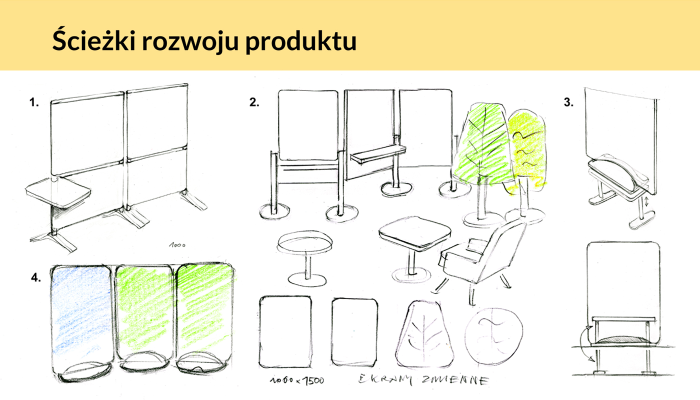 Kierując się estetyką Wydziału Form Przemysłowych, starałam się, aby zaprojektowane przedmioty były spójne z charakterem uczelni. Parawany codzienne, będące modułowe, umożliwiają różnorodne konfiguracje i mogą zostać wzbogacone o dodatkowe elementy, takie jak tablica magnetyczna czy miejsce na notatki. Regulowany stolik zapewnia komfort użytkowania przez różne osoby, w różnych warunkach pracy. Dodatkowo, możliwość zmiany konfiguracji parawanów pozwala na stworzenie przestrzeni do rozmów, odpoczynku czy wspólnej pracy.