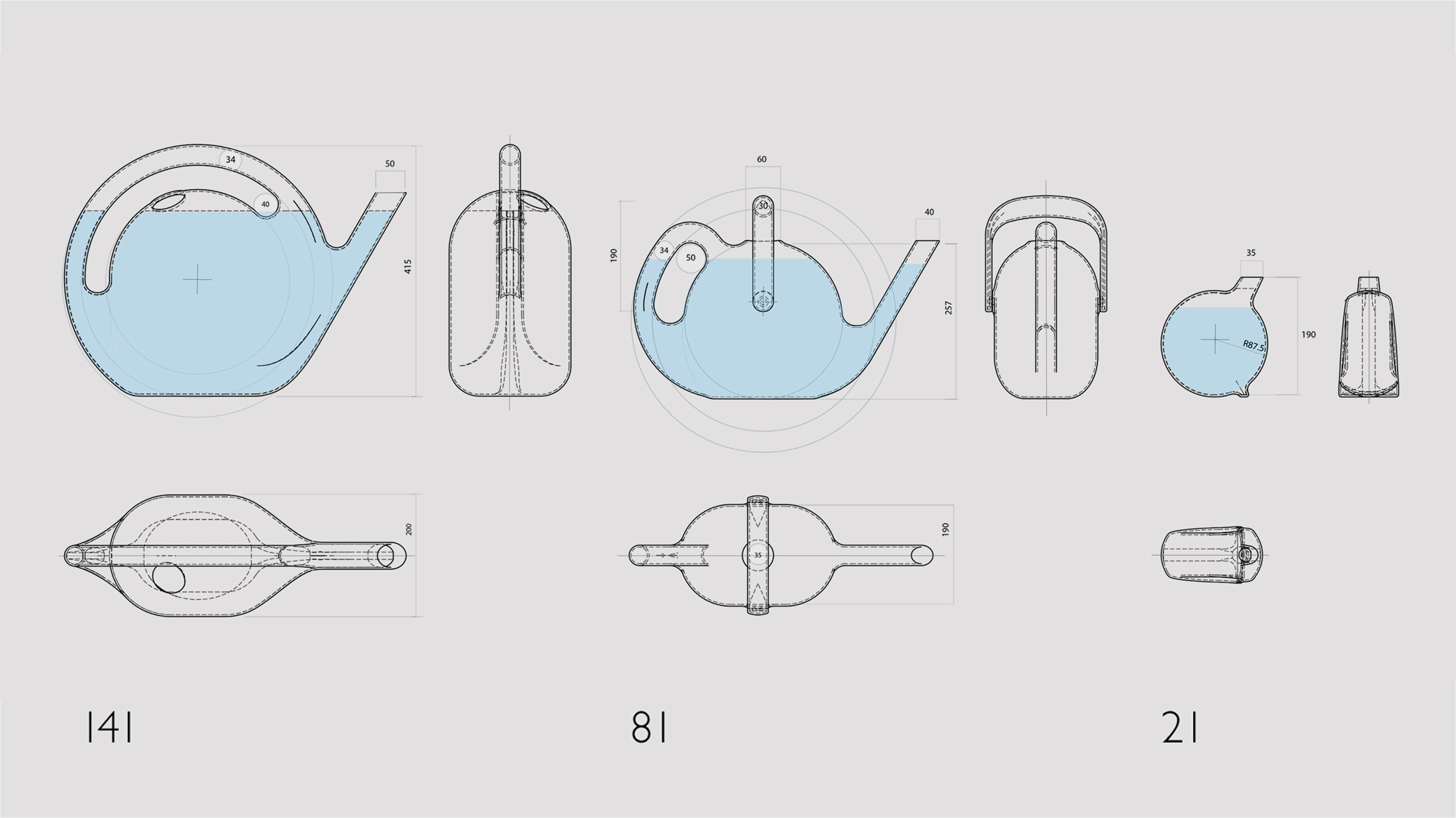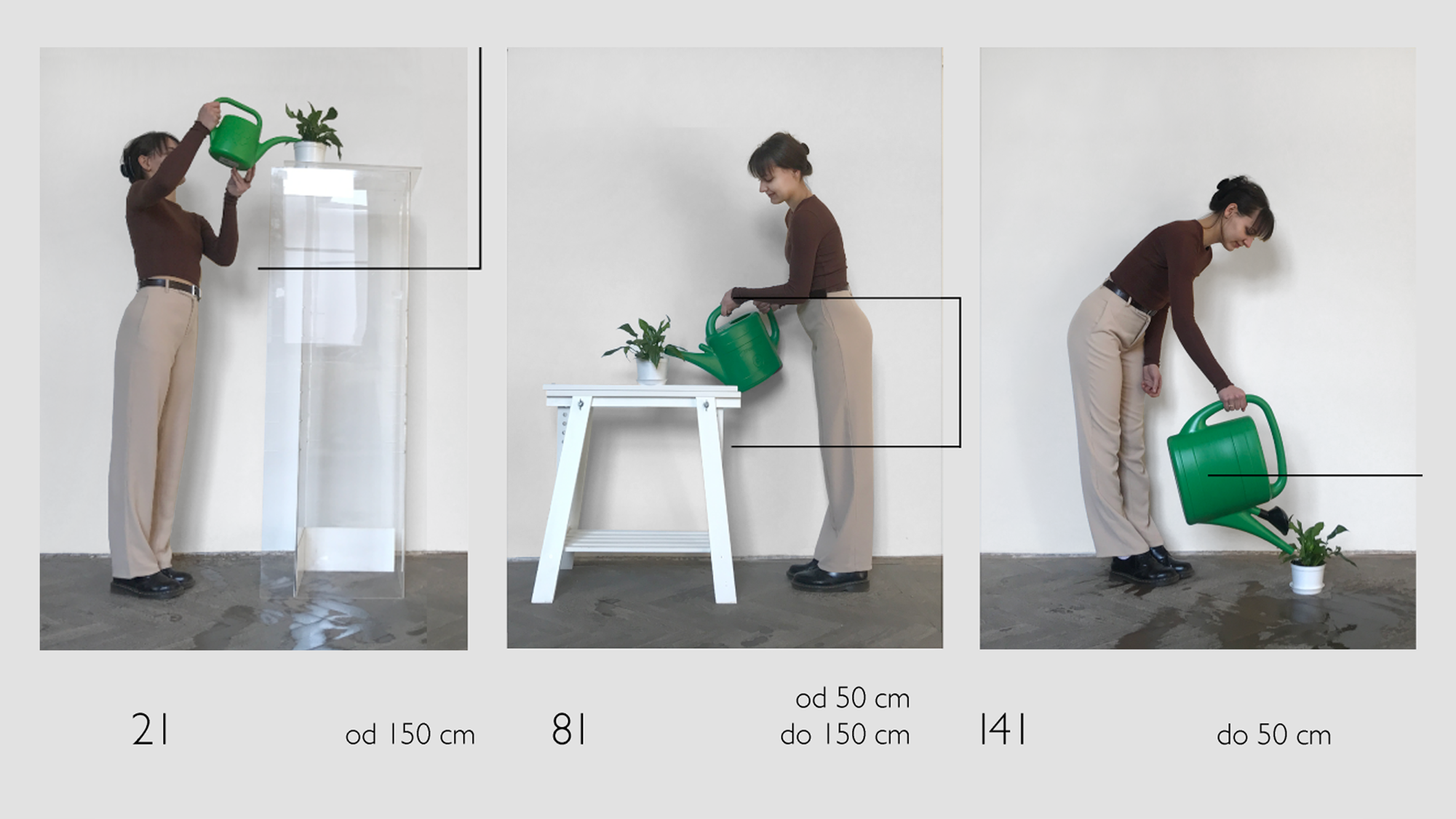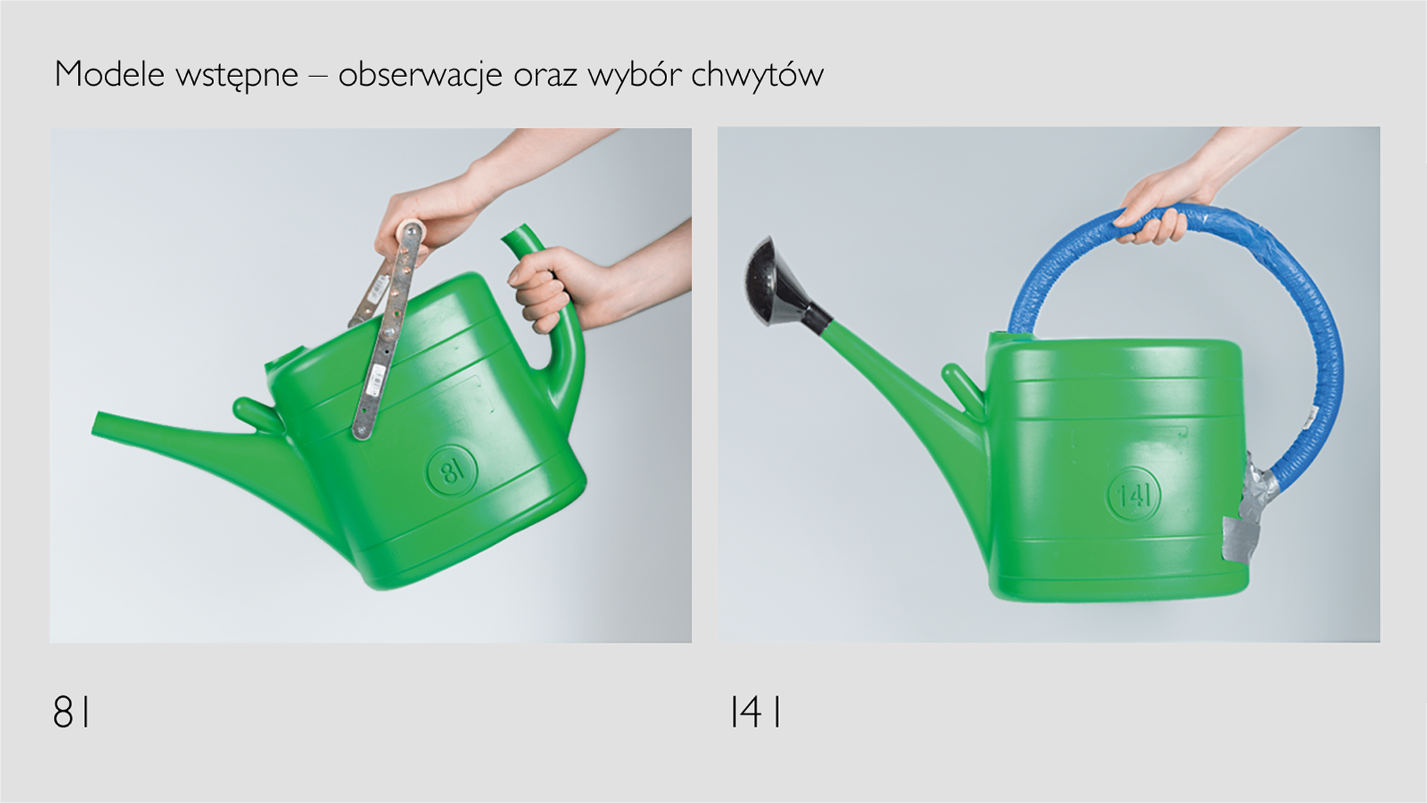 Nabytą wiedzę pozyskaną na wykładach z zakresu podstaw ergonomii wykorzystano w ćwiczeniach projektowych w zakresie analizy relacji układu ręka-uchwyt – na przykładzie kształtowania uchwytu wybranych pojemników na dowolny płyn. Wybrane zostały konewki o trzech pojemnościach, adekwatnie do sytuacji w których zwykle są używane (po jednej pojemności konewki dla każdej z osób w zespole) 2l, 8l, 14l . W ramach zadania dokonano rozeznania rynkowego dotyczącego projektowanych produktów. Przeprowadzono wywiady z użytkownikami konewek oraz obserwacje podczas podlewania roślin. Dla każdej pojemności konewki wykonano modele funkcjonalne w skali 1:1 i o ciężarze właściwym dla danej pojemności, sprawdzając poprawność trzymania i rodzaj chwytu dla ręki prawej oraz lewej (uchwyty wykonano z glinki modelarskiej). Zaobserwowano iż przy konewkach o pojemności 8 oraz 14 litrów – chwyt jest dwuręczny, a przy 2 litrowej – chwyt jednoręczny z możliwością dodatkowej stabilizacji drugą ręką. W projekcie zostały uwzględnione najistotniejsze potrzeby dotyczące uchwytu, dla osób podlewających kwiaty. Zwrócono uwagę na właściwe położenie środka ciężkości każdej z konewek podczas przenoszenia i podlewania. Zadbano także o spójność stylistyczną grupy projektowanych produktów. Wykonano modele wirtualne wraz z wizualizacjami. Docelowe modele imitacyjne wykonano ze styroduru wykorzystując technologię frezowania CNC.