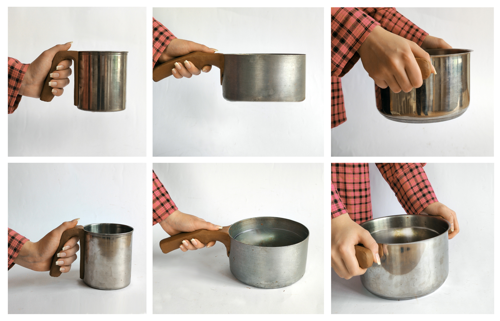 Celem zadania było zaprojektowanie ergonomicznego uchwytu dla wybranego pojemnika na dowolny płyn. Praca realizowana była w trzyosobowych grupach. Każda osoba z grupy miała wybrać do zaprojektowania pojemnik o innej pojemności a co za tym idzie innym chwycie. W założeniu wszystkie zaprojektowane pojemniki powinny stanowić spójną wizualnie rodzinę produktów (w tym przypadku wybrano garnki). Praca rozpoczęła się od analizy garnków dostępnych na rynku. Po wyborze rodzaju i pojemności garnka rozpoczęła się praca modelowania uchwytów w glince modelarskiej oraz próby chwytu wykonanych modeli naczyń z uchwytami. Próby dokonywane były z pełnym obciążeniem pojemników. Istotnym aspektem projektu było zaprojektowanie takiej formy uchwytu, która wpasuje się w rękę i pozwala na wygodny, pewny chwyt o jak największej powierzchni stycznej do powierzchni stycznej trzymającej ręki z uchwytem. Z tego powodu opracowane rozwiązania uchwytów mają obłe kształty o miękkich krawędziach, zapewniające komfort trzymania pojemnika. Spójną formę uzyskano projektując uchwyt zintegrowany w całą formę z nakładką okalającą metalowe naczynie, pozostawiając właściwe naczynie w formie czystego walca. Taki zabieg pozwolił także na izolację chroniącą użytkownika przed oparzeniem.