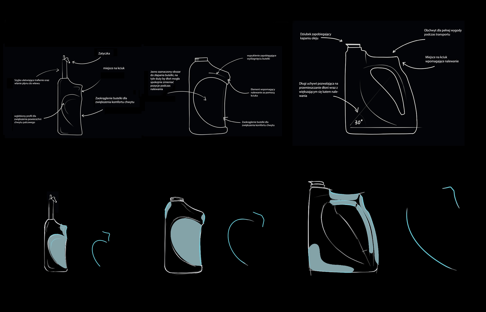 Celem zadania było zaprojektowanie ergonomicznego uchwytu dla wybranego pojemnika na dowolny płyn. Grupa (trzyosobowa) wybrała pojemniki na oleje samochodowe o różnych pojemnościach (0,4l, 1l i 5l) Każdy z pojemników, mając inną pojemność oraz ciężar musiał mieć inny chwyt. W założeniu wszystkie zaprojektowane pojemniki powinny stanowić spójną wizualnie rodzinę produktów. Praca rozpoczęła się analizą dostępnych na rynku opakowań na oleje samochodowe. Po wyborze rodzaju i pojemności pojemników rozpoczęła się praca modelowania uchwytów w glince modelarskiej oraz próby chwytu wykonanych modeli opakowań. Próby dokonywane były z pełnym obciążeniem pojemników. Istotnym aspektem projektu było zaprojektowanie takiej formy uchwytu, która wpasuje się w rękę i pozwala na wygodny, pewny chwyt o jak największej powierzchni stycznej do powierzchni trzymającej ręki. Zaprojektowane miejsca uchwytu w mniejszych pojemnikach, mają dopasowane wielkości do trzymającej ręki, o kształcie wypełniającym przestrzeń wewnątrz ręki z elementami stabilizującymi pojemnik podczas trzymania i nalewania. Pojemnik 5 litrowy ma uchwyt pozwalający na zmianę miejsca trzymania w zależności od kąta pochylania pojemnika przy wylewaniu płynu. Przekrój uchwytu jest dopasowany do wielkości zamkniętej ręki. Spójną formę uzyskano projektując pojemniki na bazie podobnego przebiegu krawędzi tworzących formę pojemników.