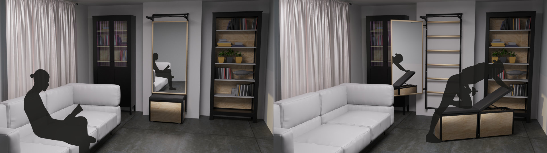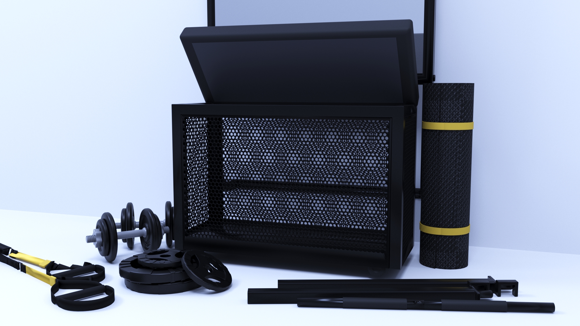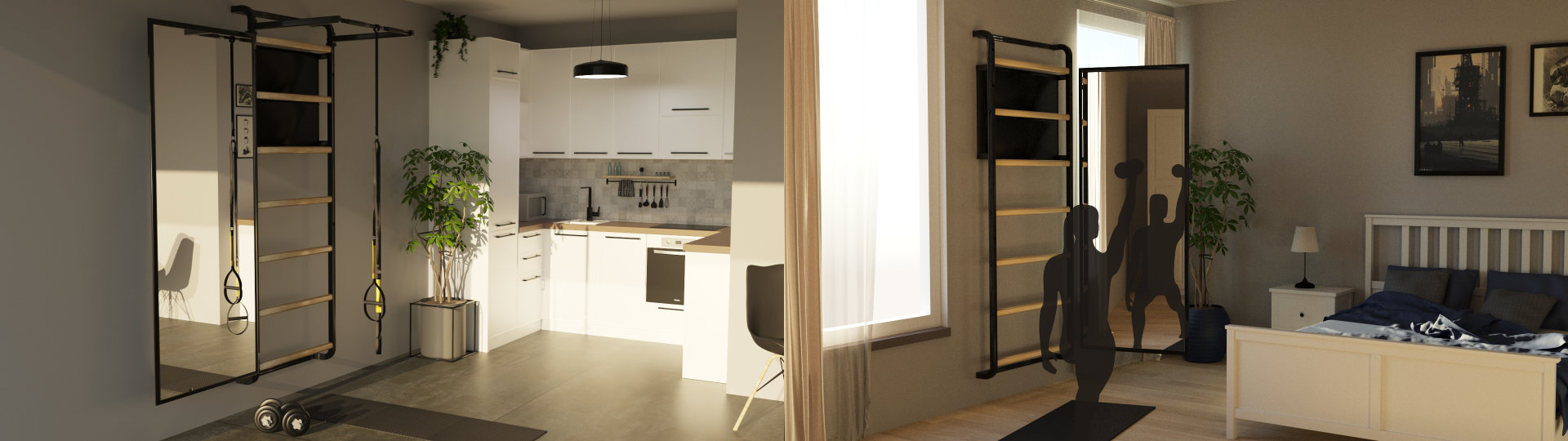 Projekt kompaktowej, wielofunkcyjnej stacji treningowej, wpisującej się gabarytami i estetyką we współczesne wnętrza mieszkalne.