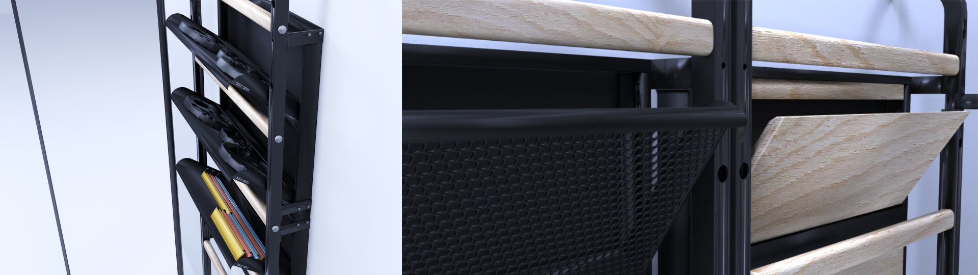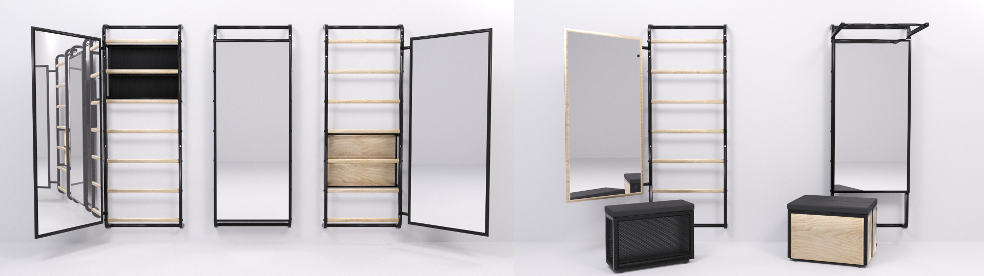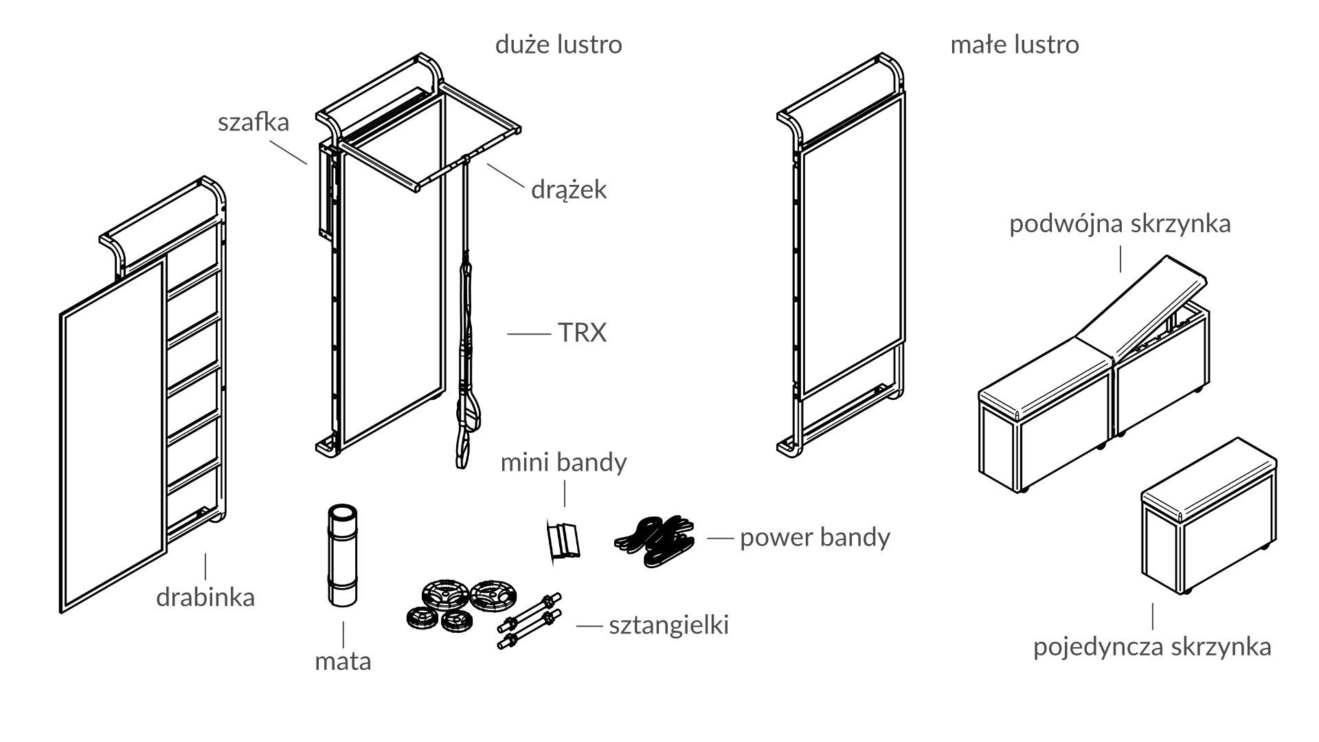 Głównymi i stałymi elementami konstrukcji są drabinka gimnastyczna oraz lustro, które z jednej strony pełni funkcję wspomagającą ćwiczenia, z drugiej kryje stację treningową. Dodatkowym elementem są szafki, których położenie i ilość możemy dostosowywać według własnych potrzeb. W pełnym zestawie znajduje się lustro, drabinka, modularne szafki, ławeczka z możliwością przechowywania, drążek, TRX, zestaw taśm, sztangielki oraz mata do ćwiczeń.