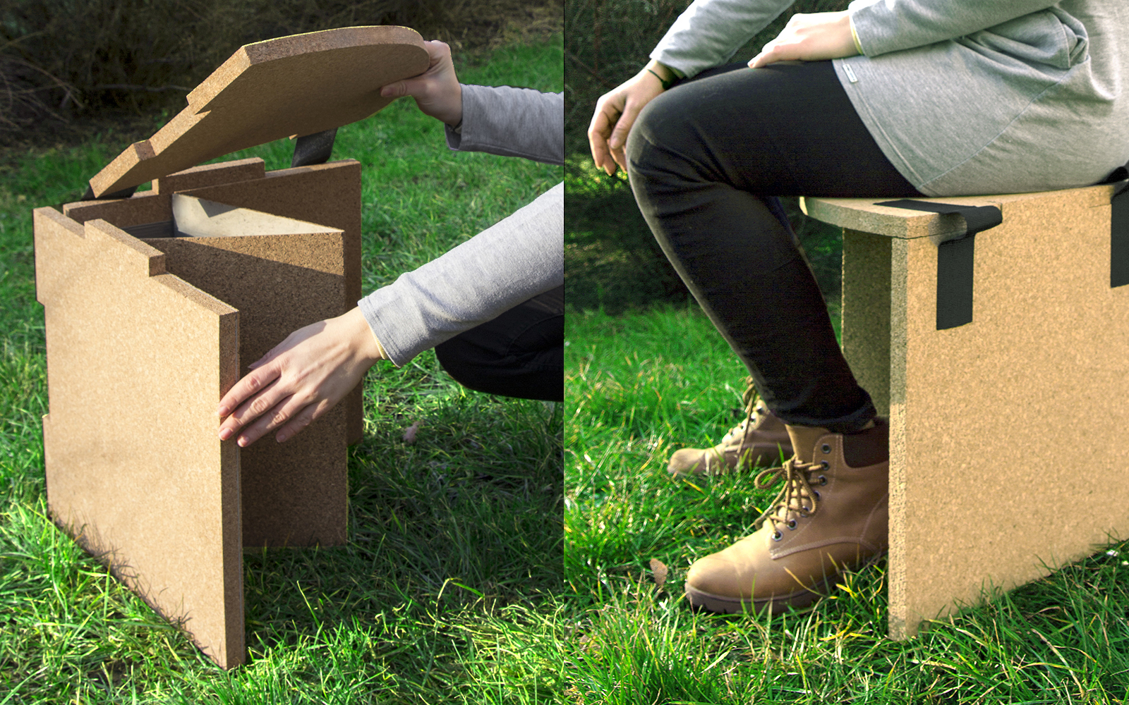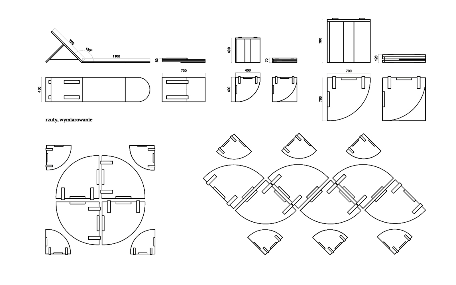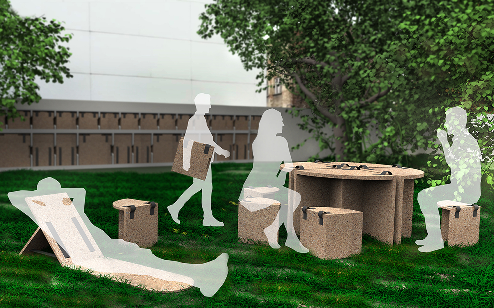 Temat pracy dotyczy wspierania aktywności i integracji mieszkańców Krakowa a ścisłą grupą odbiorców projektu są studenci Wydziału Form Przemysłowych. Przestrzeń docelowa to uczelniany ogród. Projekt mebli ogrodowych powstał z myślą o zwiększeniu funkcjonalności studenckiej przestrzeni. W skład zestawu wchodzą stołki, stoły i leżaki. Wszystkie elementy są składane na płasko, składowane przy ścianie. Taki sposób kształtowania ma na celu minimum ingerencji w przestrzeń ogrodu. Opiera się na założeniu, w myśl którego konieczne jest poszanowanie fenomenu miejsca i jego naturalnego środowiska. Atrakcyjność formy poszczególnych elementów polega na prostocie, łatwym montażu i możliwości samodzielnej aranżacji. Imprezy zorganizowane, studenckie spotkania, warsztaty, wykłady w plenerze czy odpoczynek na łonie natury – proste a zarazem wielofunkcyjne meble znajdą zastosowanie w różnych sytuacjach. Korek o zwiększonej odporności mechanicznej, jako lekki, wodoodporny, a przede wszystkim naturalny materiał zachowuje spójność z naturalnym środowiskiem. Ideą projektu jest zachęcenie studentów do przebywania