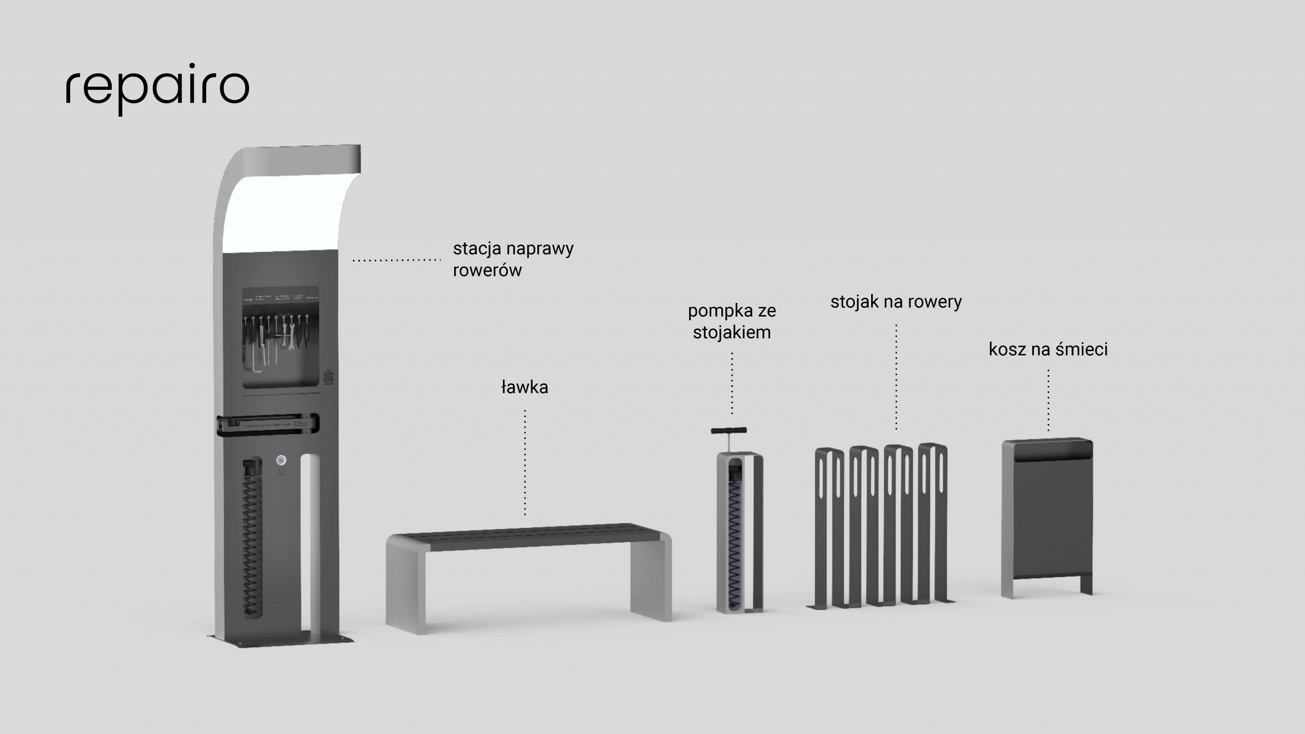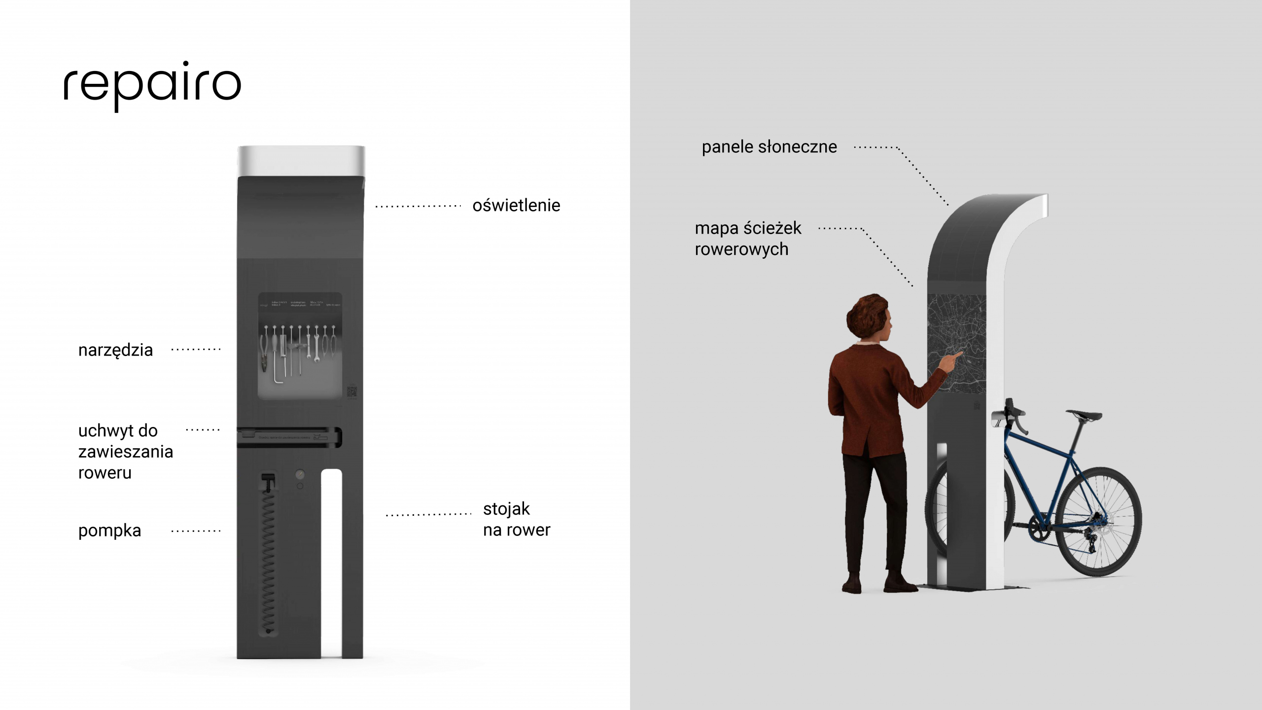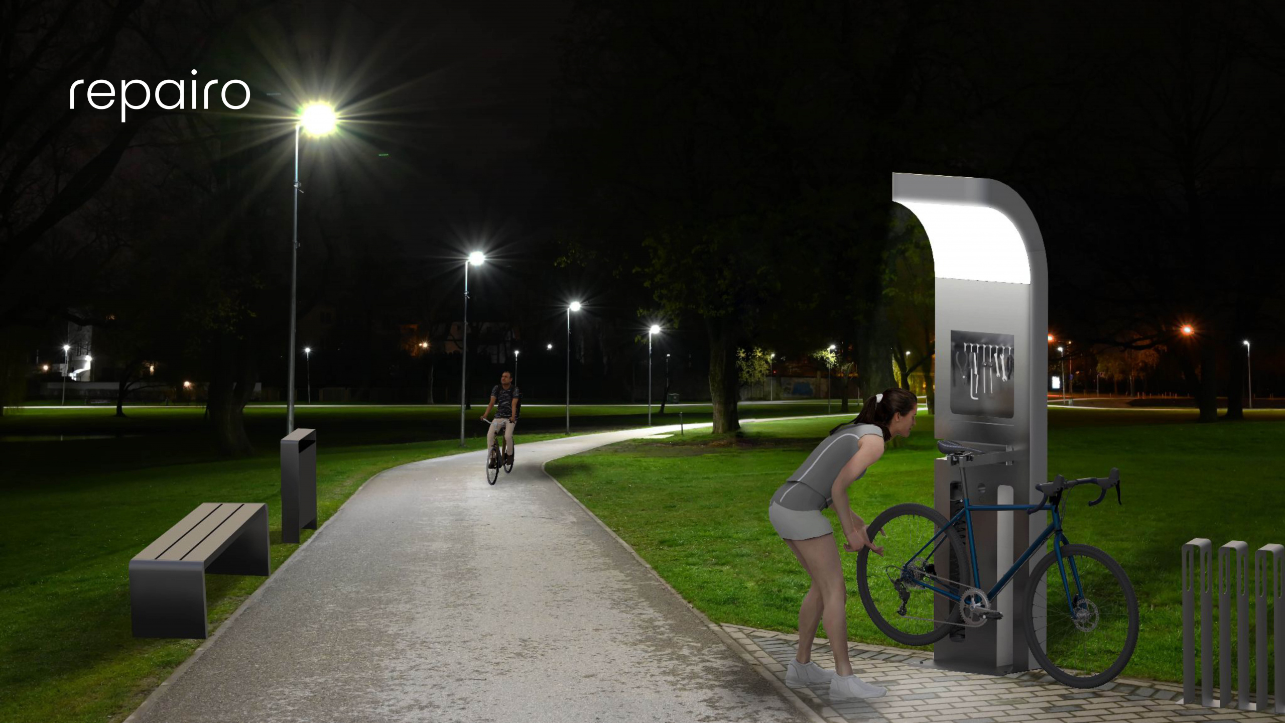 Repairo to miejska, ogólnodostępna stacji napraw rowerów. Obiekt zasilany jest panelami słonecznymi umieszczonymi na dachu obiektu. Pozwala to oświetlić miejsce naprawy oraz zasila kompresor. W stacji znajdują się podstawowe narzędzia przymocowane do linek, umieszczonych na zwijaczu. To rozwiązanie zwiększa komfort użytkowania i chroni narzędzia przed dewastacją. Komfortowi naprawy sprzyja również możliwość zawieszenia roweru w czterech różnych pozycjach. Gdy koła są pompowane, użytkownik może skorzystać ze szczeliny stabilizującej rower. W tylnej części stacji znajduje się mapa ścieżek rowerowych. W zestawie oprócz stacji napraw, przewidziane są ławka, kosz na śmieci oraz ręczna pompka.