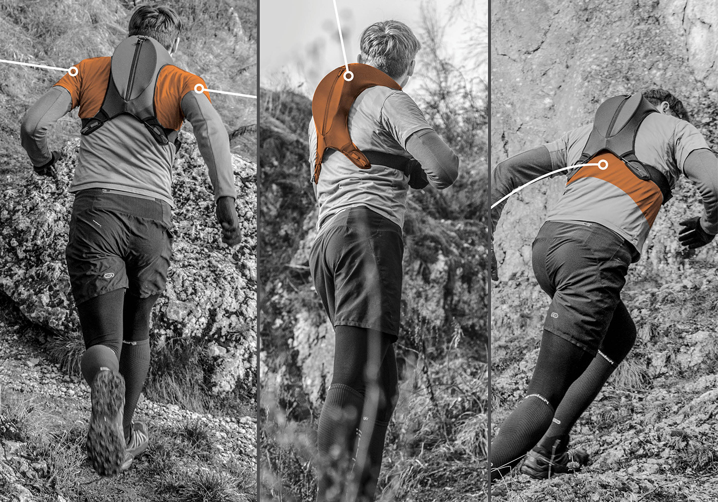 Celem pracy było zaprojektowanie plecaka poprawiającego komfort podczas długodystansowych biegów górskich z ekwipunkiem. Głównym powodem używania plecaka w czasie biegu jest konieczność uzupełniania deficytu płynów oraz energii. Biegacz musi być również przygotowany na zmienne warunki atmosferyczne, bieg w nocy, czy konieczność przechowywania apteczki. Aby plecak jak najlepiej spełniał swoją rolę zostały ustalone założenia determinujące aspekty ergonomii i funkcjonalności. Geometria projektu opiera się wyłącznie na odcinku piersiowym co pozwala na swobodną rotację w osi kręgosłupa. Umiejscowienie środka ciężkości pomiędzy łopatkami jednocześnie powoduje zmniejszenie się bocznych przechyłów plecaka oraz uwalnia obręcz barkową umożliwiając szeroki zakres ruchu. Dodatkowo mała powierzchnia styku z ciałem zapewnia dobrą wymianę ciepła. Oparcie konstrukcji o elastyczną ramę z włókna szklanego pozwoliło spełnić ustalone założenia. Sposób w jaki zostały poprowadzone pręty szklane zapewnia pełne wykorzystanie właściwości materiału oraz jednocześnie buduję formę plecaka.