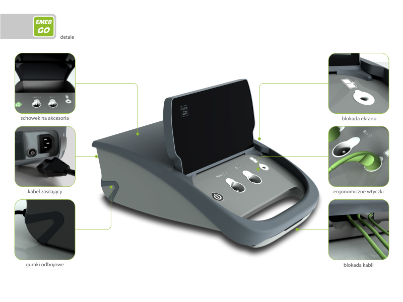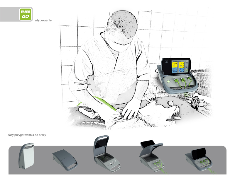 Aparat elektryczno-chirurgiczny, popularnie nazywany diatermią, to współczesny skalpel. Służy do cięcia i koagulacji tkanek. Projekt Emed GO jest koncepcją przenośnej wersji aparatu. Urządzenie ma ułatwić pracę chirurgów w terenie. Może być wykorzystywane w małych gabinetach chirurgicznych zajmujących się weterynarią, dermatologią lub kosmetologią. W projekcie rozwiązane zostały problemy, z którymi zmagają się na co dzień użytkownicy takie, jak plączące się kable czy utrudnione przenoszenie. Urządzenie wyróżnia się łatwym transportem, kompaktową budową i współczesną estetyką.