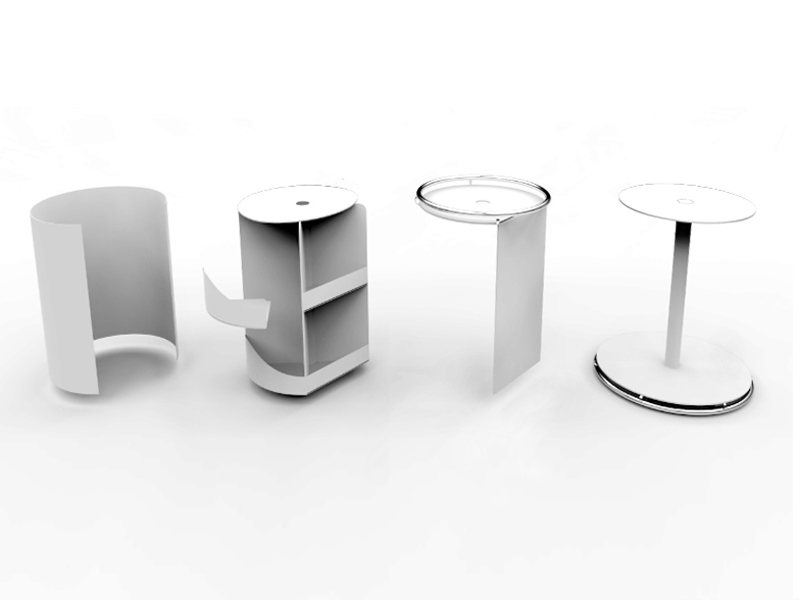 Szafka szpitalna przeznaczona jest dla dzieci w wieku od 6 do 12 lat. Składa się z 4 głównych elementów: górnego blatu, wewnętrznej obrotowej konstrukcji z półkami z regulowaną wysokością, ruchomej osłony oraz obrotowo otwieranego blatu. Obrotowa budowa zapewnia maksymalny dostęp w pozycji leżącej i siedzącej do zawartości każdej półki. Przycisk w górnym blacie opuszcza szafkę unieruchamiając ją (przez blokowanie kółek). Blat można bardzo łatwo przybliżyć do dziecka znajdującego się w łóżku w pozycji półleżącej lub siedzącej. Szafka wyposażona jest w wejścia usb do ładowania sprzętu elektronicznego i lampkę nocną. W dolnej części znajduje się zwijacz kabla elektrycznego.