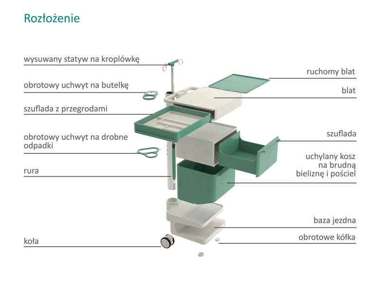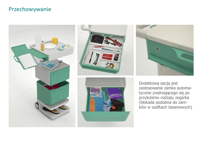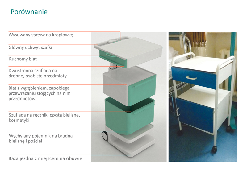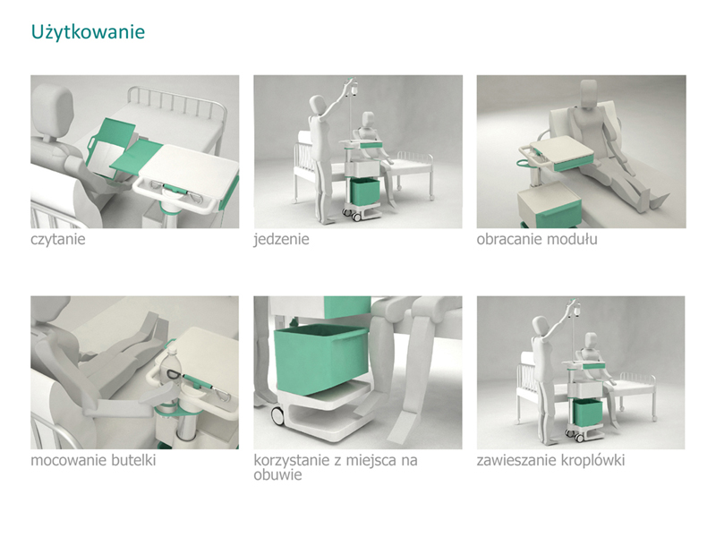 Zaprojektowana szafka przyłóżkowa to mebel umożliwiający spełnianie najważniejszych potrzeb pacjenta (jak: jedzenie, czytanie, segregacja osobistych przedmiotów). Składa się z bazy jezdnej, rury konstrukcyjnej, pojemnika na brudną bieliznę i pościel, wysuwanego statywu na kroplówki oraz dwóch szuflad. Nad górną szufladą znajduje się ruchomy blat. Poszczególne moduły szafki mogą być zastępowane innymi tak, aby spełniały wymagania konkretnego oddziału. Mebel zapewnia komfortowe użytkowanie, porządek przechowywanych w nim przedmiotów. Jego forma i materiały, z których został wykonany ułatwiają utrzymanie odpowiedniego poziomu czystości.