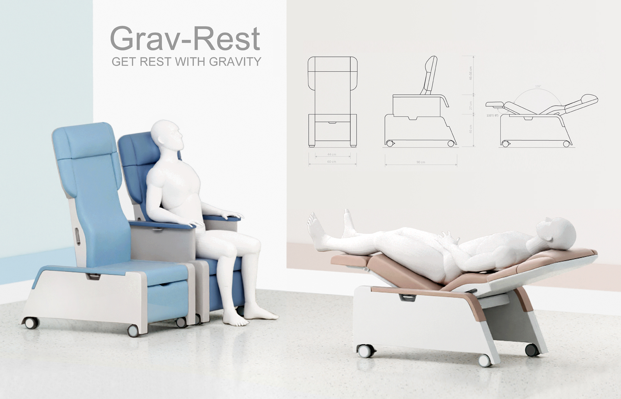 Siedzisko dla personelu bloku operacyjnego, zaprojektowane z myślą o regeneracji między zabiegami. Umożliwia przyjęcie pozycji półleżącej typu „zero gravity”, która odciąża kręgosłup, redukuje napięcie mięśniowe, poprawia krążenie krwi i wspiera regenerację organizmu. Konstrukcja umożliwia niezależną regulację podparcia podudzi, odcinka lędźwiowego, karku oraz kończyn górnych – zapewniając dopasowanie do sylwetki użytkownika. Regulowane podparcie kończyn górnych pełni dodatkowo funkcję wspomagającą przy wstawaniu. Siedzisko jest ergonomiczne, przystosowane dla użytkowników od 5cK do 95cM, mobilne, łatwe do dezynfekcji i przystosowane do użytkowania w warunkach szpitalnych.