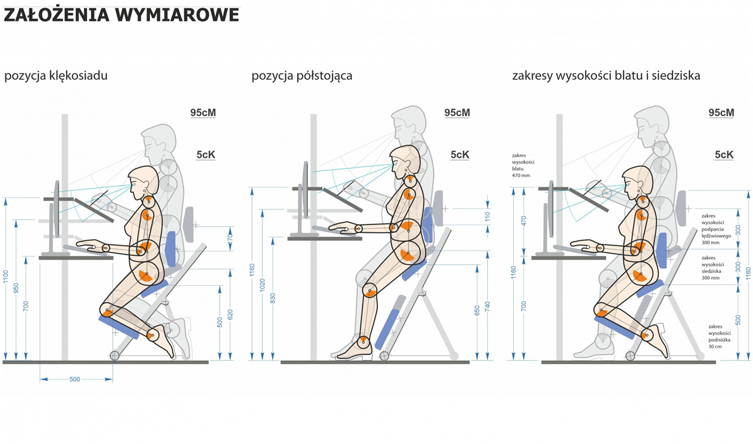 Na podstawie analizy antropometrycznej dla 5 centyla kobiet i 95 centyla mężczyzn określono zakresy regulacji wysokości i ustawienia podpór. Siedzisko oraz podkolanniki osadzone na przegubach umożliwiają kontrolowane mikro ruchy, wspierając naturalną dynamikę ciała i ograniczając negatywne skutki pozycji statycznych. Zintegrowane podparcie odcinka lędźwiowego stabilizuje miednicę, nie blokując jej ruchomości.