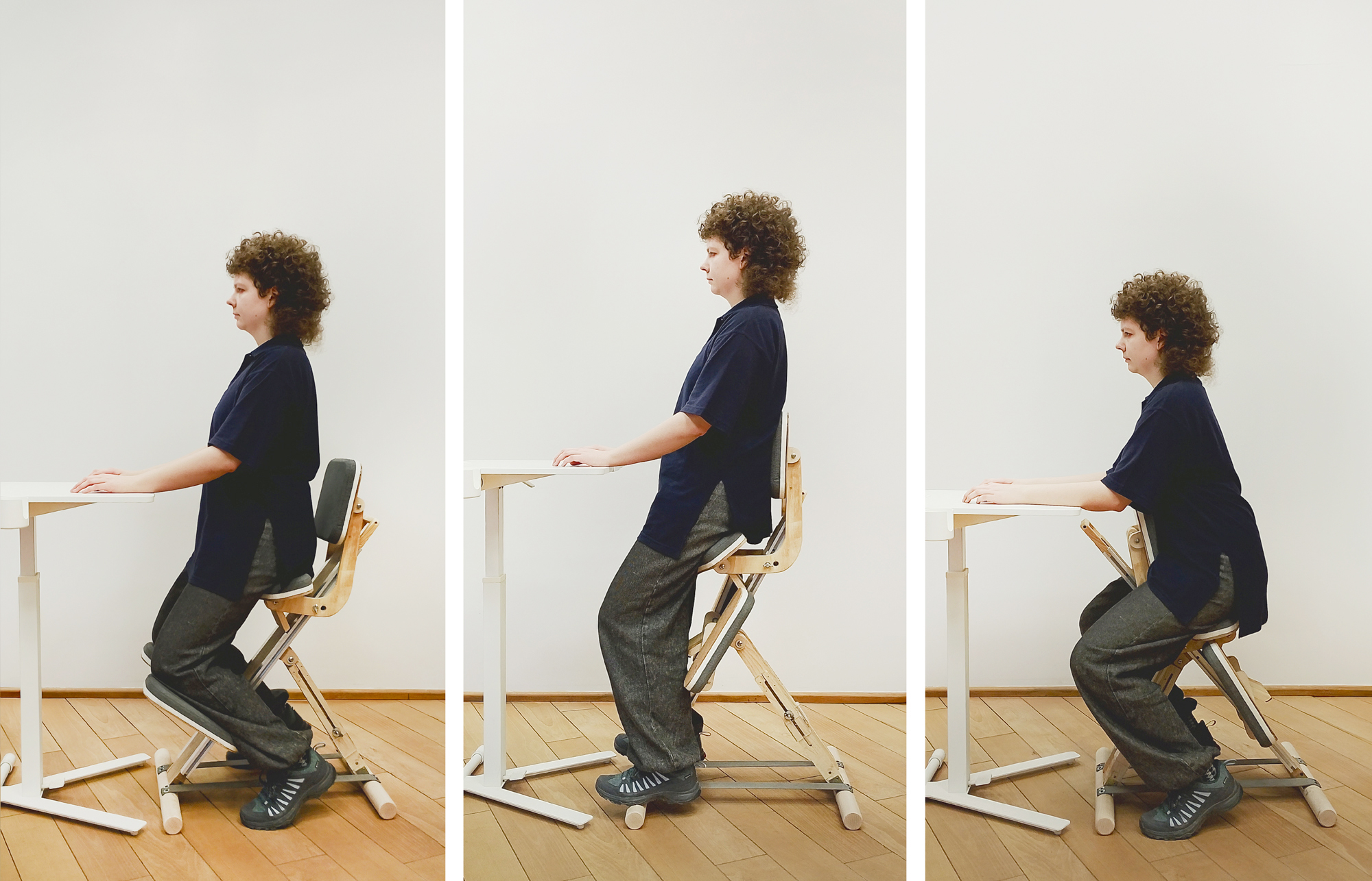 Analiza stanowiska pracy oraz obserwacja skutków długotrwałego siedzenia wykazały, że kluczowym problemem jest statyczność prowadząca do przeciążeń odcinka lędźwiowego, zamknięcia kąta biodrowego i spadku aktywności mięśni posturalnych. Projekt umożliwia pracę w pozycjach alternatywnych – klęczącej i półstojącej. Pozycje te otwierają sylwetkę, sprzyjają wyprostowi tułowia oraz aktywizują miednicę.