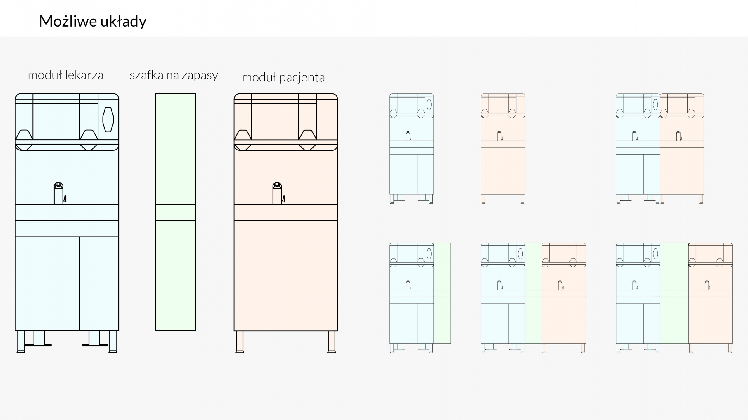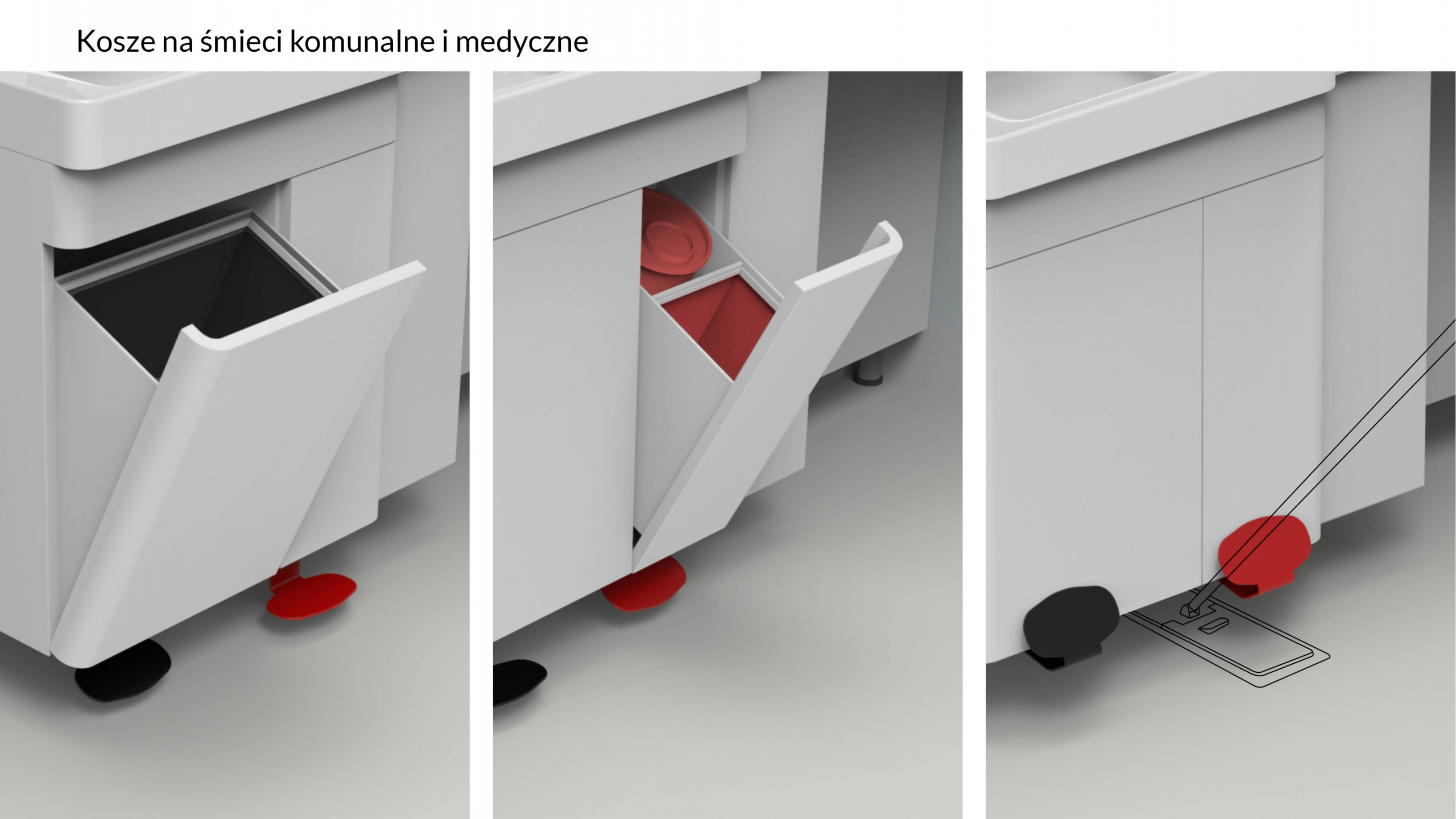 Projekt stanowiska higienicznego do gabinetu lekarza pierwszego kontaktu oraz gabinetu zabiegowego. Projekt składa się z umywalki dla lekarza, pacjenta oraz szafki na zbiorniki z dodatkowymi płynami higienicznymi. W przestrzeni poniżej 20 cm szafka stanowi puste wypełnienie. Bezdotykowe dozowniki na mydło, ręczniki papierowe, płyn do dezynsekcji, rękawiczki, zostały umieszczone w kolejności zgodnej z procedurą utrzymywania higieny pracy lekarza. Pod umywalką umieszczone są otwierane nogą kosze na śmieci komunalne oraz medyczne
