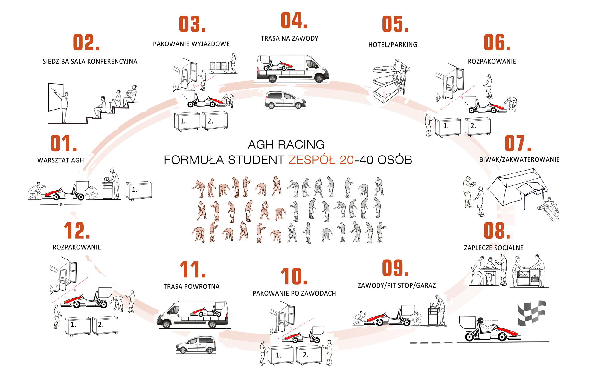 W ramach projektu opracowywane jest skuteczne rozwiązanie eliminujące lub redukujące problemy związane z transportem na zawody sportowe Racing Team AGH. Rozwiązanie opiera się na dedykowanym systemie modułowym, który jest dostosowywany do konkretnej trasy, liczby uczestników zawodów, wielkości zaplecza technicznego i socjalnego oraz czasu trwania wyjazdu. Projektowany system będzie mógł obsłużyć od 6 do 21 osób. Szczegółowe cele projektu koncentrują się na rozwiązaniu konkretnych problemów jak: Elastyczność rozwiązania:
