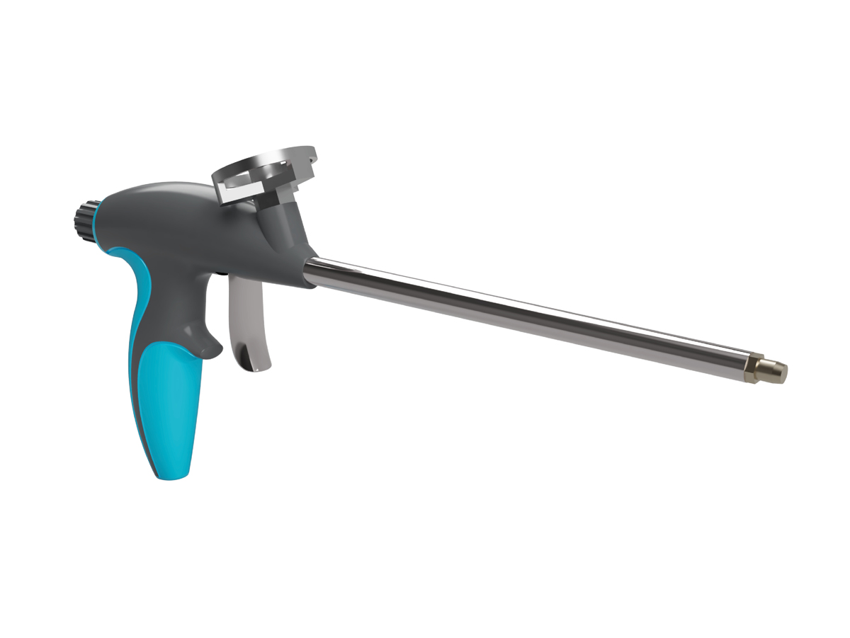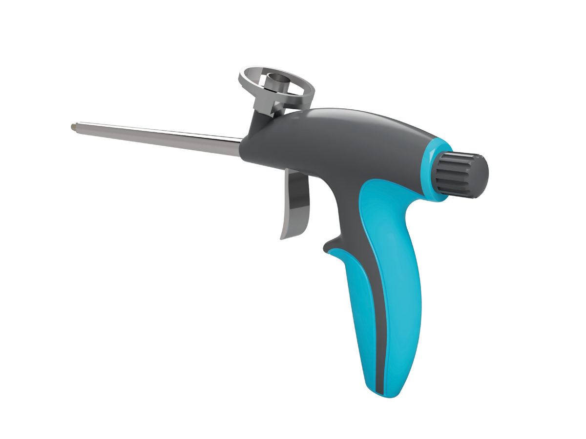 Projekt pistoletu do piany montażowej realizowany był we współpracy z producentem - firmą Euromac oraz konsultowany z potencjalnymi użytkownikami. Przy projektowaniu formy urządzenia zaproponowano całkowitą obudowę układu mechanicznego, co sprzyja utrzymaniu narzędzia w czystości. Kształt uchwytu jest płynny, odpowiedni dla funkcji trzymania. Dla większego komfortu pracy zastosowano wtrysk dwukomponentowy z tworzywa konstrukcyjnego i elastomeru, zapewniającego większą przyczepność i wygodę. Pokrętło do regulacji wypływu piany położone jest w dogodnym miejscu, a jego wielkość dostosowana jest do charakteru manipulacji. Zastosowana kolorystyka ułatwia odnajdywanie narzędzia w miejscu pracy.