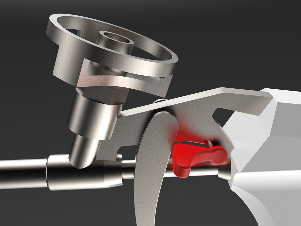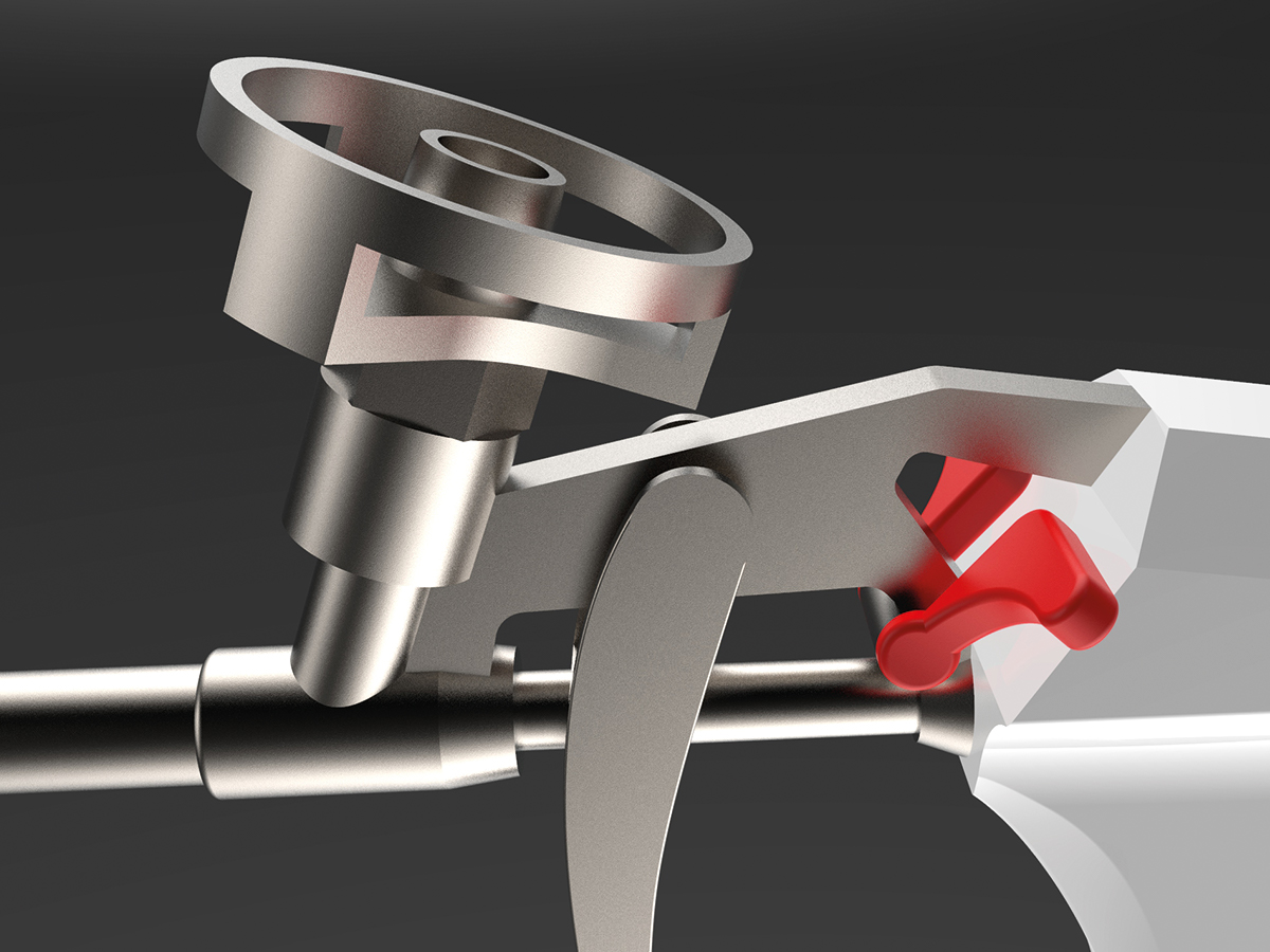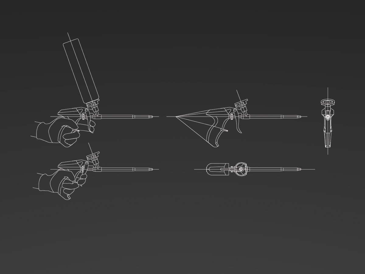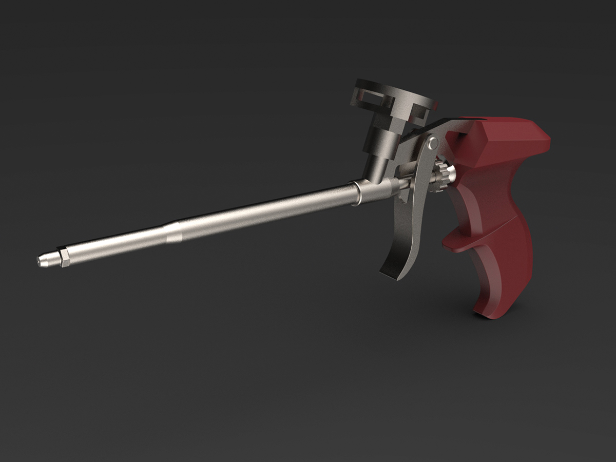 Głównym założeniem projektu było uwzględnienie trzech głównych punktów podparcia podczas odchylania pistoletu w trakcie pracy w przód i w tył. Zapewnia to korzystny rozkład sił, stabilność chwytu oraz pewną manipulację narzędziem. Rezygnacja z tradycyjnego umiejscwienia śruby regulacyjnej zapewnia dostateczną ilość miejsca dla stabilnego oparcia pistoletu o mięśnie kłębu pomiędzy kciukiem a palcem wskazującym. Zaproponowane są dwa rodzaje regulacji i blokady spustu. Pierwszym jest umiejscowienie śruby zaraz za spustem, a alternatywą jest prosta blokada mechaniczna powodująca unieruchomienie i zabezpieczenie spustu przed przypadkowym wciśnięciem - w tym wypadku regulacja strumienia piany następuje przy pomocy siły nacisku na spust. Forma pistoletu jest prosta i zgeometryzowana z wyraźnie uwydatnionymi liniami podziałów, które swój zbieg znajdują w jednym punkcie.
