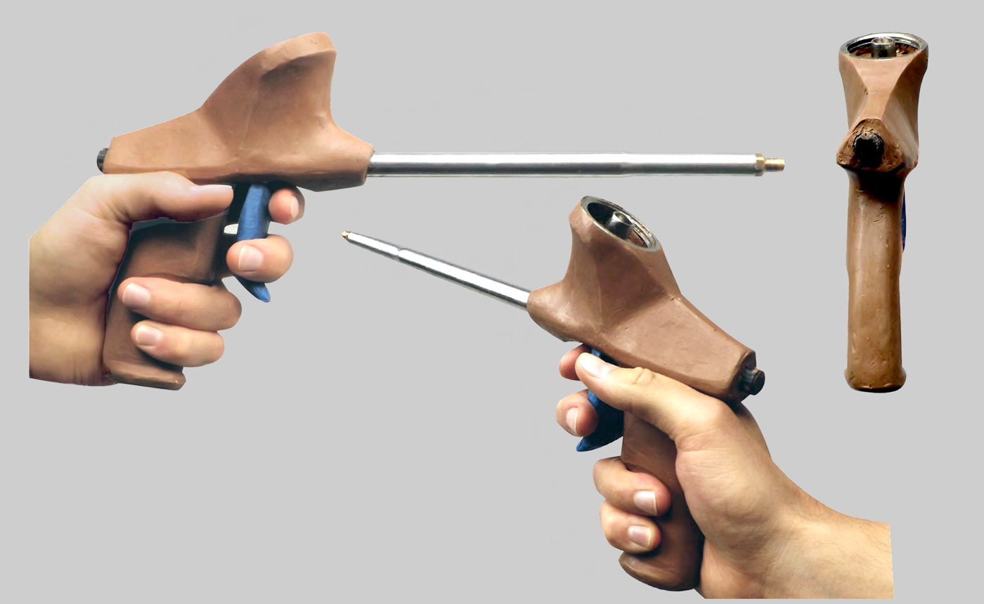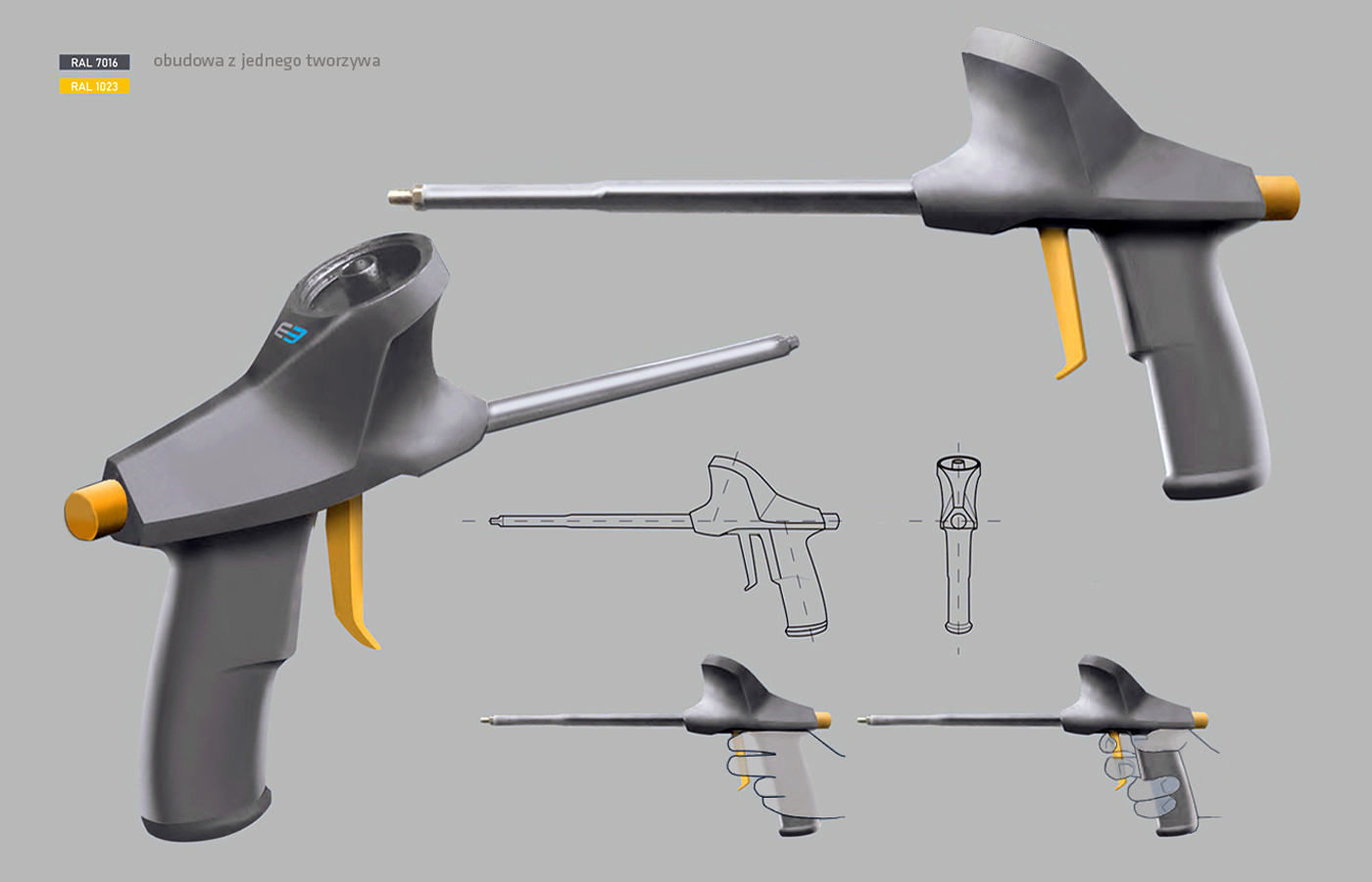 Projekt pistoletu do piany montażowej realizowany był jako praca semestralna, we współpracy z producentem pistoletów firmą Euromac z Gdyni Celem mojego projektu było stworzenie bezpiecznego i komfortowego w użytkowaniu uchwytu pistoletu. Ukrycie mechanizmu w obudowie ma za zadanie ułatwienie czyszczenia z piany. Kształt obiektu łączy w sobie inspirację naturą (perkozem dwuczubym) i ciężką, silnie zgeometryzowaną bryłą wzorowaną na architekturze brutalistycznej.