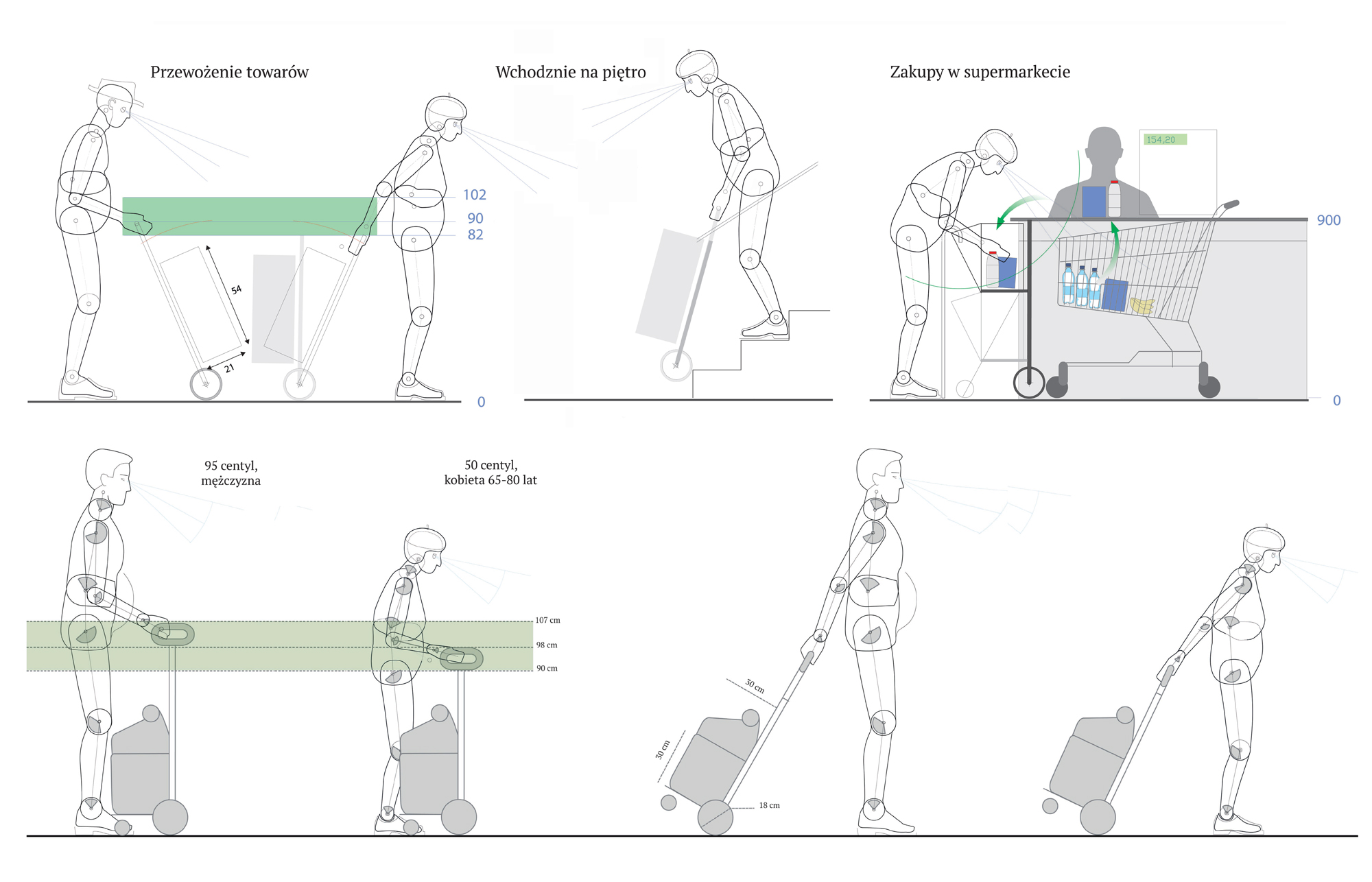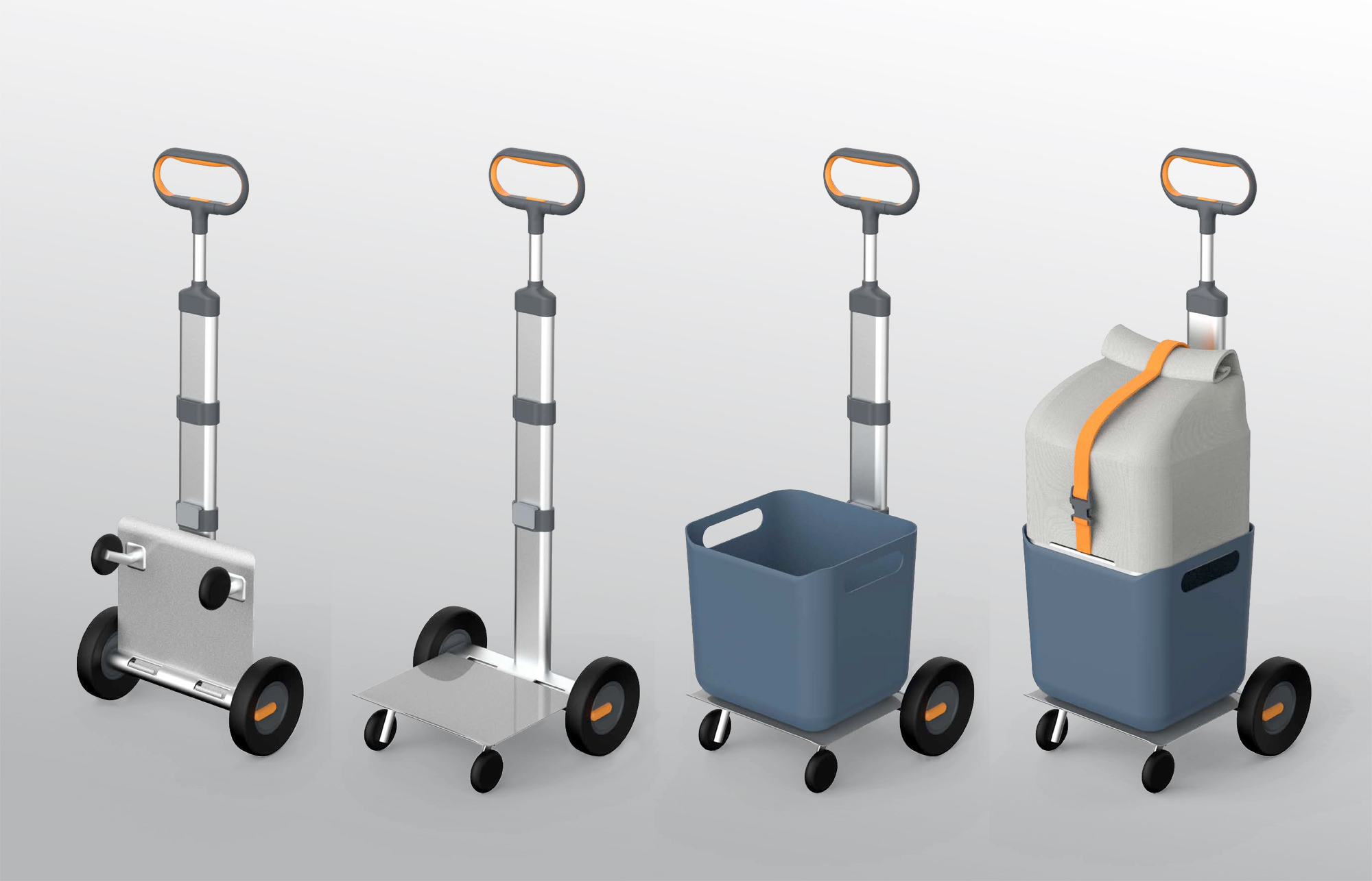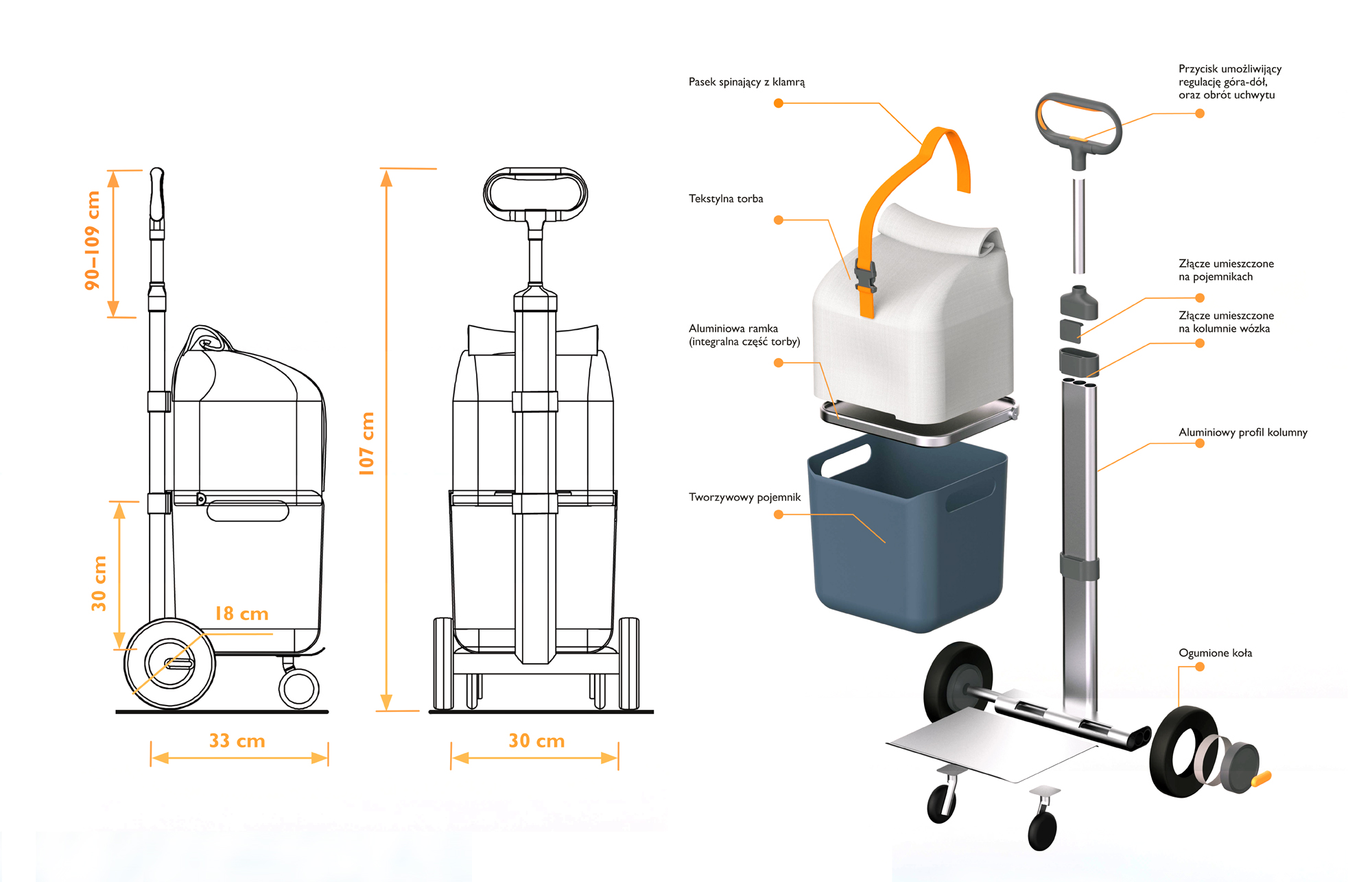 Wózek na zakupy został zaprojektowany z myślą o łączeniu funkcjonalności i wygody, aby poprawić doświadczenia zakupowe. Dzięki neutralnej estetyce produktu wpisze się w gusta rozmaitych użytkowników, niezależnie od ich wieku. To, co wyróżnia go na tle innych produktów, to możliwość prowadzenia bokiem jak walizkę, jak również standardowo ciągnięcia za sobą. Ergonomiczny i obrotowy uchwyt oraz dwie przestrzenie do załadunku, zapewniają łatwość użytkowania oraz optymalne zarządzanie przestrzenią zarówno podczas pakowania jak i przy rozpakowaniu. Zastosowanie kółek o większej średnicy zapewnia łatwiejsze pokonywanie barier architektonicznych i terenowych. Platformę wózka można złożyć, co ułatwia przechowywanie, a kosze załadunkowe można wykorzystać do przechowywania produktów w domu.