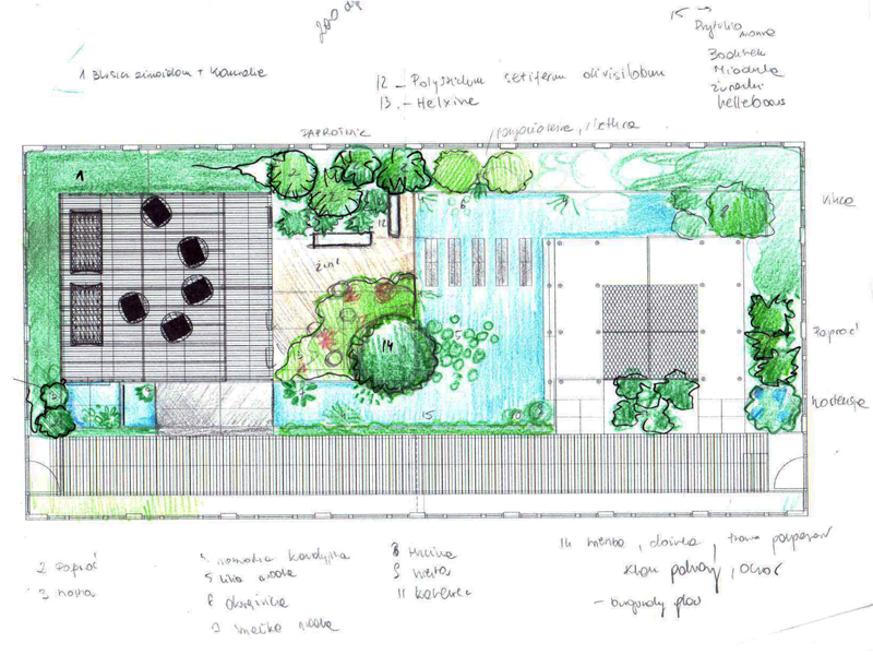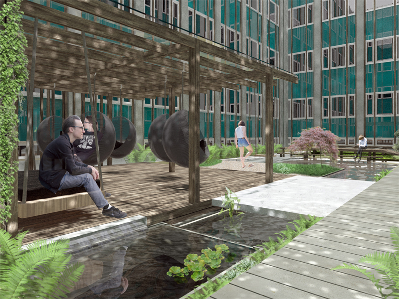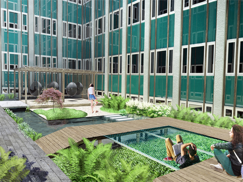 Patio Biblioteki Głównej powszechnie uważane jest za miejsce zaniedbane i nieatrakcyjne. Koncepcja ma na celu rewitalizację przestrzeni jako miejsca wyciszenia i relaksu, przy zachowaniu charakteru architektury i istniejącej tam zieleni. W projekcie przewidziano drewnianą, ażurową pergolę, podest z siatką i zbiornik wodny, w którym znajdują się rośliny i ryby. Dopełniającymi elementami są podwieszone ławy, kosze, huśtawki i siatki umożliwiające zmianę pozycji ze statycznej na aktywną. Łącznikiem całego patia jest płynąca woda, której szum nadaje miejscu relaksacyjny charakter. Dodatkową atrakcją jest siatka umieszczona na wydzielonym podeście pozwalająca na przyjmowanie pozycji sprzyjającej obserwacji nieba. Ważną cechą koncepcji jest bujna wodna, nadwodna i cieniolubna roślinność, która dzieli i wycisza przestrzeń.