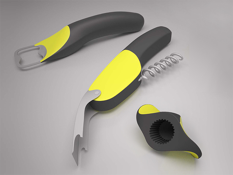 Zadanie zespołowe, mające na celu zaprojektowanie i wykonanie zestawu modeli trzech uchwytów narzędzi do otwierania butelek. Obiekty zaprojektowane zostały zgodnie z zasadami ergonomii. Otwieracze dedykowane są osobom na stanowisku barmana. Zestaw składa się z otwieracza do kapsli, korkociągu oraz otwieracza do butelek typu PET. Forma uchwytów opiera się na ściętych bryłach obrotowych. Łagodne przejścia krawędzi w miejscach chwytu umożliwiają pracę przez dłuższy czas bez dyskomfortu dla użytkownika. Zastosowane barwy - grafit z żółtym detalem, który ułatwia szybką lokalizację otwieraczy na barze.