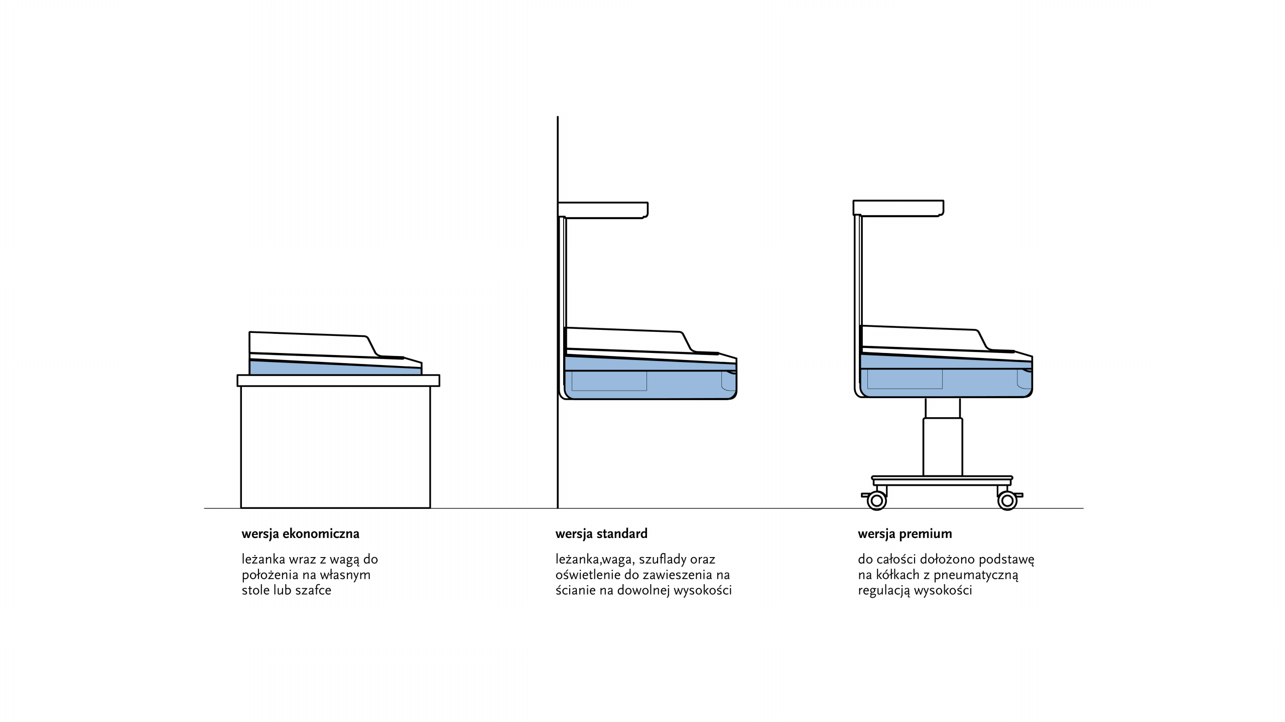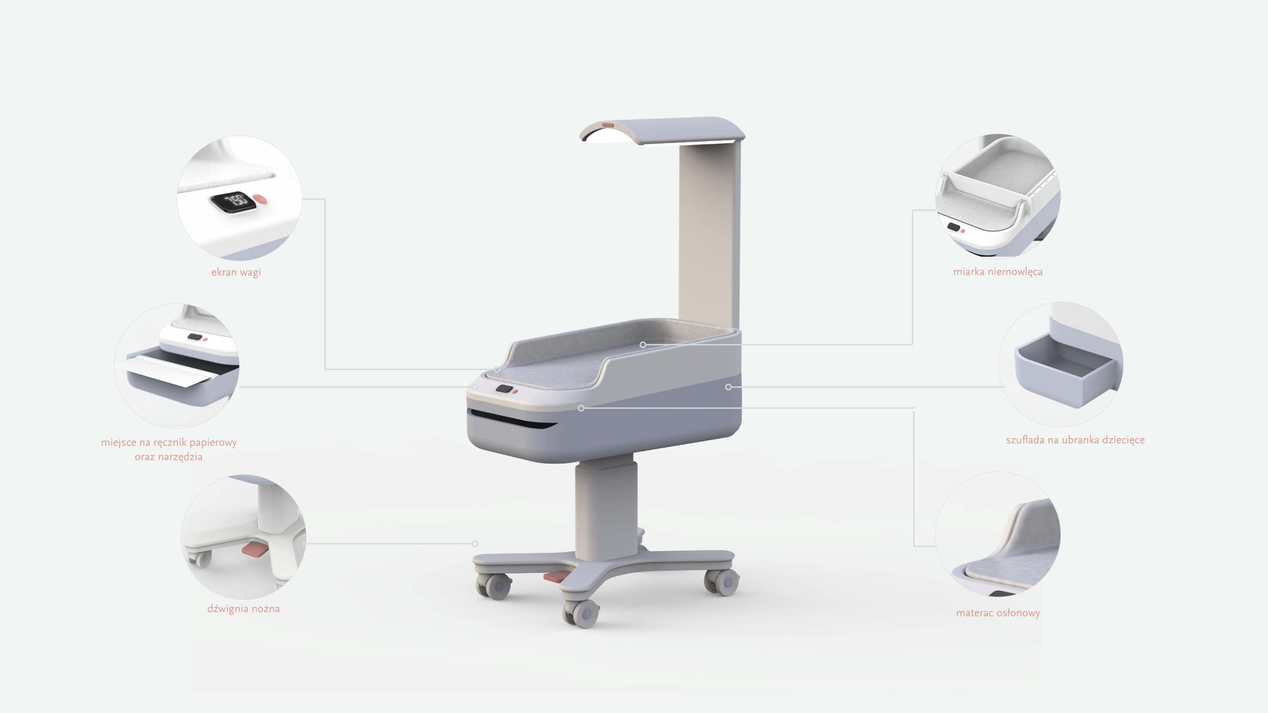 Protection to modułowe stanowisko do badania niemowląt zaprojektowane specjalnie dla gabinetów pediatrycznych. Łączy w sobie przewijak niemowlęcy, wagę oraz miarkę w jednym obiekcie. Forma umożliwia dobry kontakt (na wprost) między małym pacjentem, a lekarzem. Lekkie pochylenie przewijaka ułatwia obserwację reakcji dziecka. Sprzyja temu również moduł z oświetleniem. W przedniej części stanowiska znajduje się szuflada przeznaczona na niezbędne materiały higieniczne i narzędzia medyczne. W bocznej części znajduje się szuflada na ubranka dziecięce.